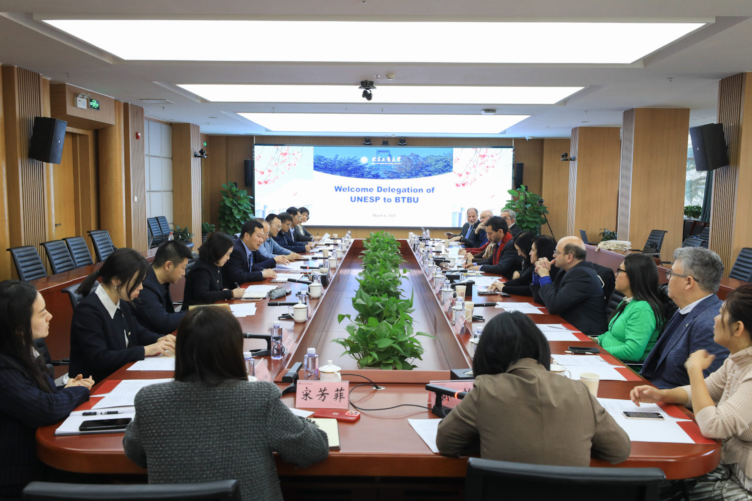 巴西圣保罗州立大学分管本科生副校长塞里亚·玛利亚·基萨提(Celia Maria Giacheti)、分管研究生副校长玛丽亚·瓦尔尼斯·博尔德林(Maria Valnice Boldrin)、分管科研副校长埃德森·科基耶里·博特略(Edson Cocchieri Botelho)、校长办公室主任塞萨尔·马丁斯(Cesar Martins)、阿西斯校区文理语言学院院长瑞尼塔·吉尔赛·乌德鲁特撤(Renata Giassi Udulutsch)、阿西斯校区文理语言学院副院长丹妮拉·诺古尔瑞·莫奈斯·加西亚(Daniela Nogueira de Moraes Garcia)、孔子学院院长路易斯·安东尼奥·保利诺(Luís Antonio Paulino)、孔子学院中方院长叶丹、首席对外关系顾问、国际处负责人乔瑟斯·塞尔索·弗莱雷(José Celso Freire Junior)、生命科学学院副教授里卡多·安东尼奥·波兰切克(Ricardo Antonio Polanczyk)、生命科学学院副教授温贝托·玛西欧·桑托斯·米拉格瑞(Humberto Márcio Santos Milagre),学校党政办公室、教务处、研究生院、科学研究院、国际交流与合作处、食品与健康学院、经济学院、商学院、国际化妆品学院相关负责人参加了此次会谈。