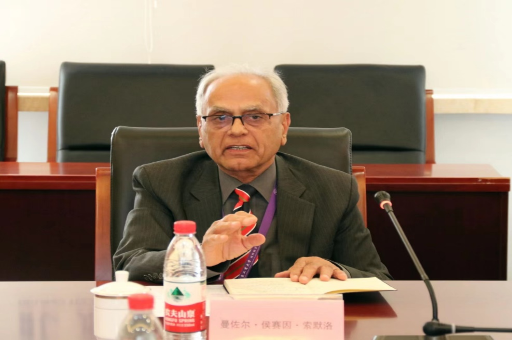 5月10日,学校名誉教授曼佐尔·侯赛因·索默洛教授(Manzoor Hussain Soomro)欢迎仪式在阜成路校区举行。党委常委、副校长刘敏华出席会议。国际经管学院院长詹新宇,人事处副处长录驰冲,国际交流与合作处副处长马雪娇,“一带一路”联合培训中心主任邸玉娜,国际经管学院数字经济系副主任韩璐参加座谈会。会议由马雪娇主持。