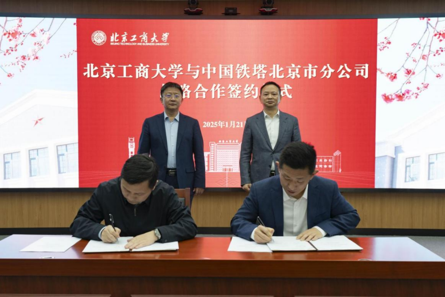 1月21日,北京工商大学-中国铁塔股份有限公司北京市分公司战略合作签约仪式在阜成路校区举行。中国铁塔北京市分公司党委书记、总经理耿时敏,党委委员、副总经理程继伟;校党委副书记、校长郭建华,党委常委、副校长寇红江出席仪式。仪式由寇红江主持。