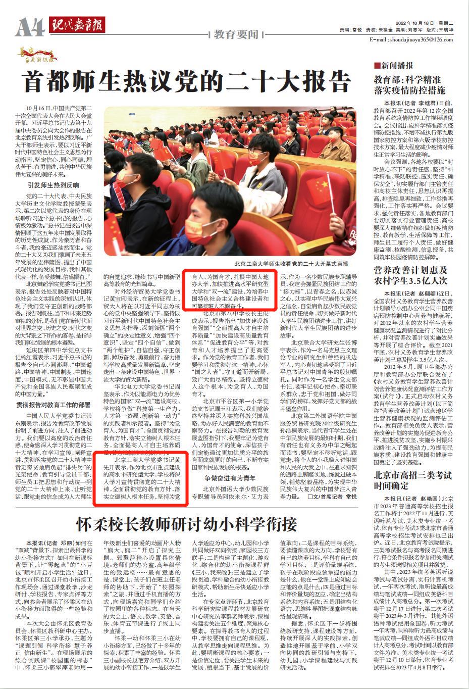 近日,现代教育报报道了首都师生热议党的二十大报告,我校党委书记黄先开包含其中,现转载如下: