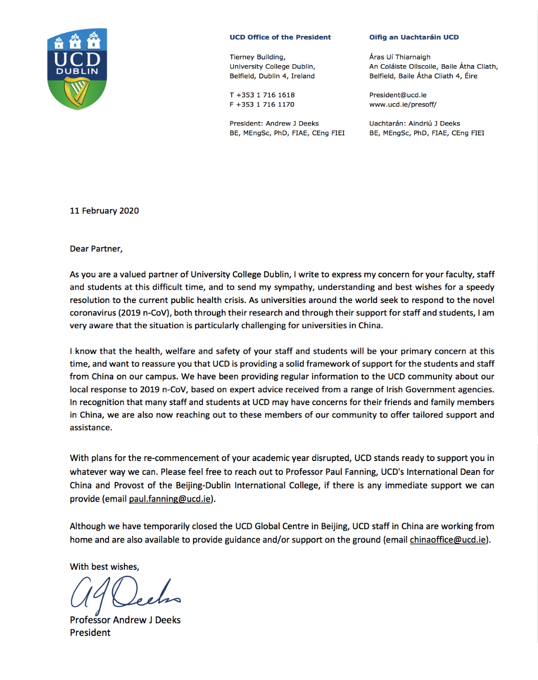 在中国抗击疫情这一困难时期,我以此信表达我校对贵校坚定不移的支持和关切。期待在不久的将来,两校共同前行,走向更美好的未来。