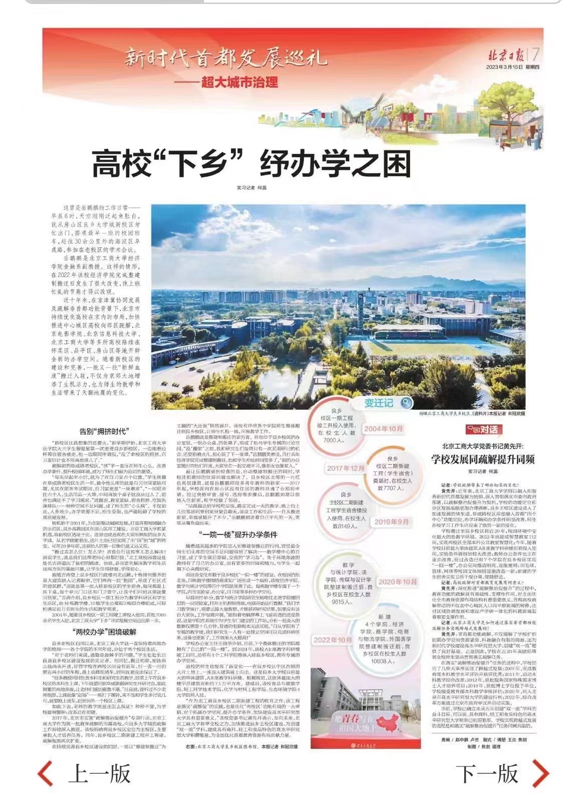 近日,北京日报以《高校“下乡”纾办学之困》为题对我校良乡主校区整建制搬迁的情况进行整版报道,现将全文转载如下: