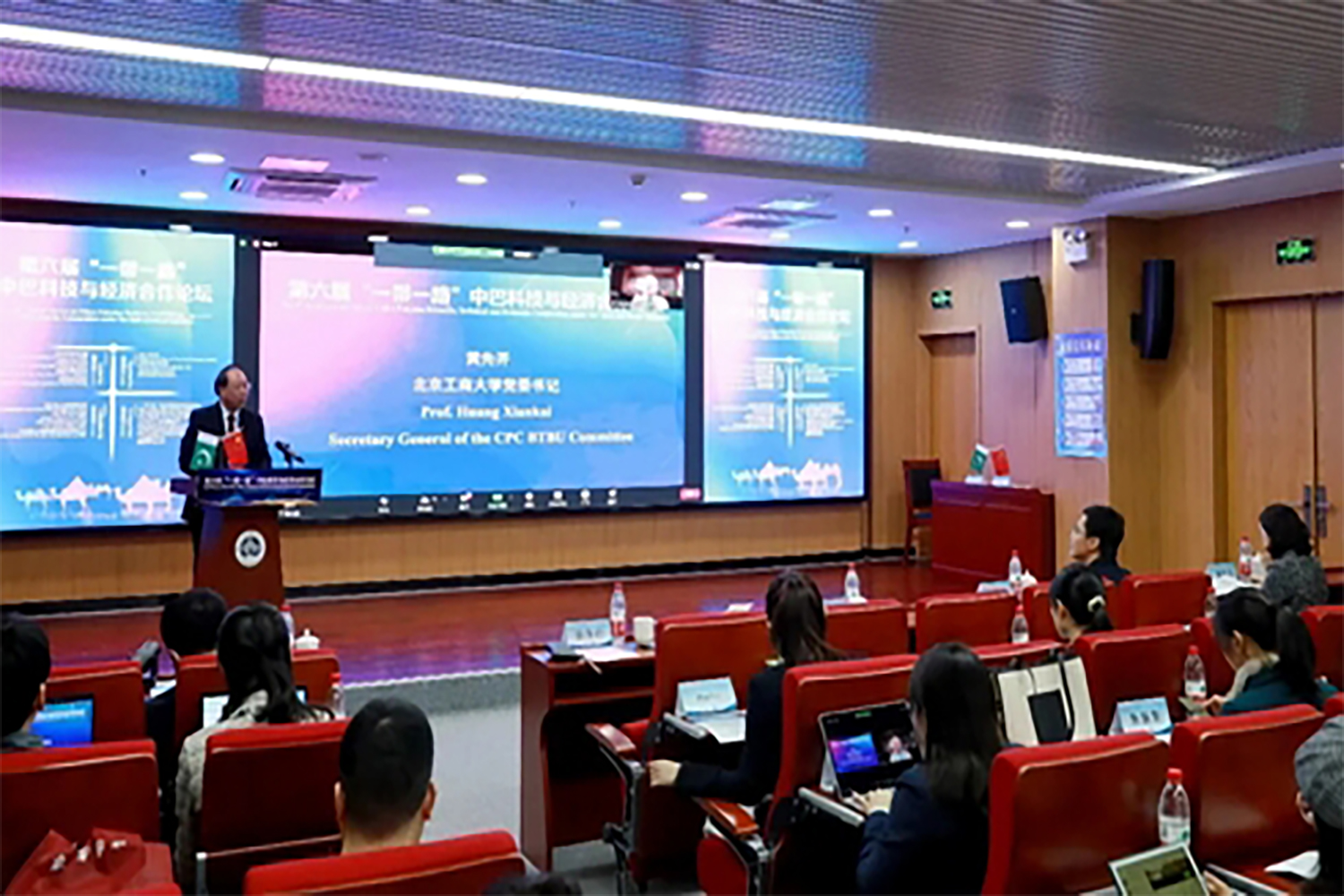 11月27日,在中国科学技术协会国际合作部、北京市科协、中国驻巴基斯坦大使馆、巴基斯坦驻华大使馆的支持下,北京工商大学联合巴基斯坦科学基金会、经济合作组织科学基金会共同举办了第六届“一带一路”中巴科技与经济合作论坛。