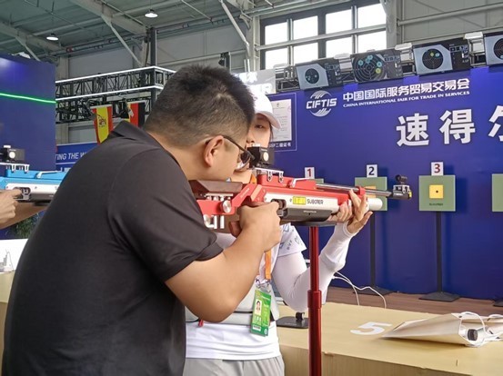 北京第二外国学院的吴承羲等四位志愿者的岗位是14号体育馆射击体验区,主要负责指导游客体验并维护电子射击设备。这项体验活动采用先进的电子感应系统,实现了无实弹的安全射击,让大众都能在零风险中感受这项运动的乐趣与科技魅力。每天8:00-17:00在岗位坚守,每天组织约千人在互动区进行排队体验。