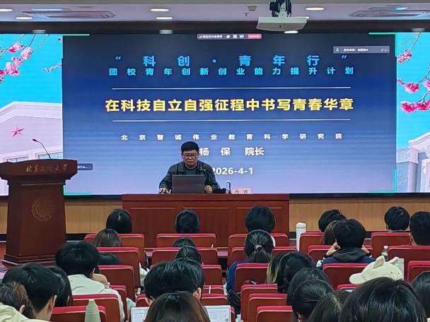现场座无虚席,学生们科创热情高涨,在不同会场认真聆听。杨保老师紧扣学习贯彻2026年全国两会精神,特别是“推动科技创新和产业创新深度融合”的部署要求,深入解读国家创新战略,传达习近平总书记考察北京亦庄国家信创园时关于“建设社会主义现代化强国,关键在科技自立自强”的重要指示精神,引导学员深刻认识时代使命。结合多年指导经验,杨保老师剖析了“挑战杯”、国创赛等创新创业赛事的育人内涵与备赛要点,分享了如何将专业所学与国家战略需求、首都产业发展痛点相结合,推动实验室成果转化为服务社会的实际项目,激发学员将个人发展融入国家科技自立自强的宏伟事业。