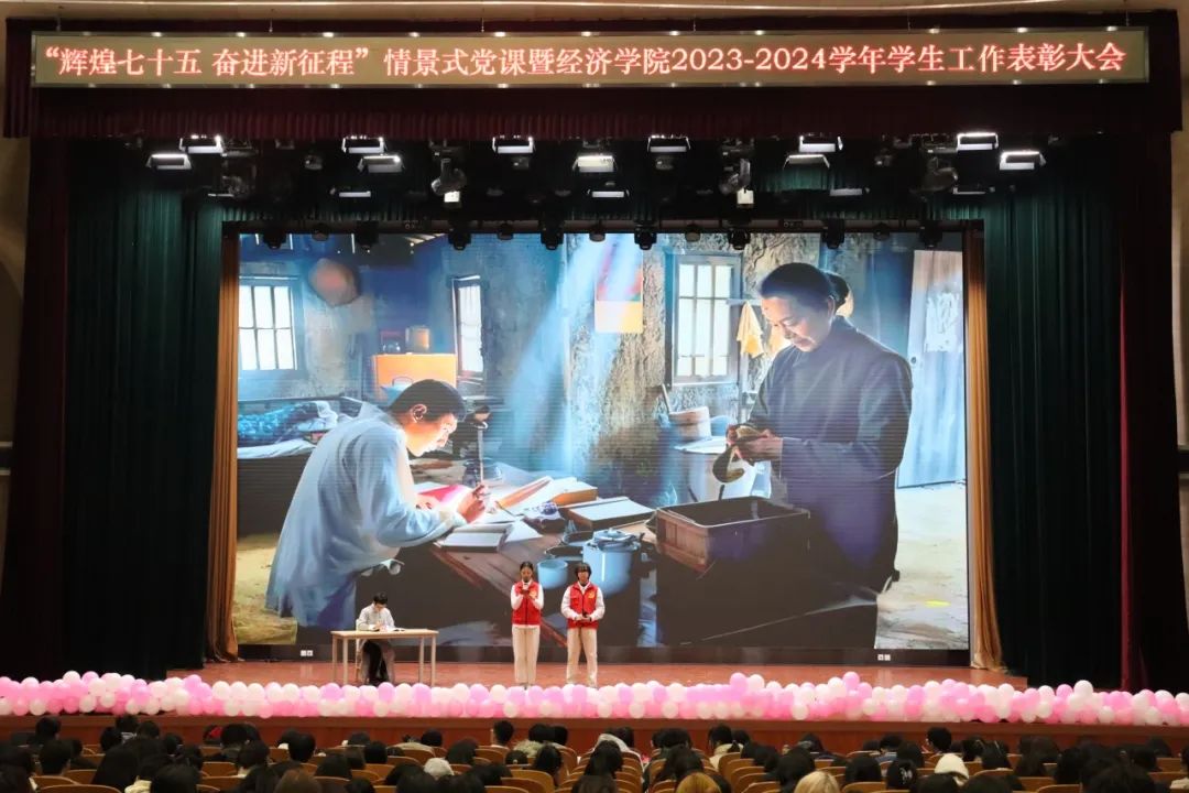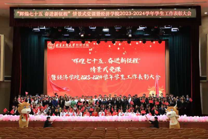 榜样熠熠,光辉相承。适逢建国75周年华诞及一二九运动89周年之际,12月4日,经济学院在良乡主校区举办“辉煌七十五 奋进新征程”情景式党课暨2023-2024学年学生工作表彰大会,旨在回顾那些激荡人心的历史瞬间,大力弘扬爱国主义精神,深切激发青年学子的家国情怀与责任担当,让红色基因与榜样力量薪火相传。