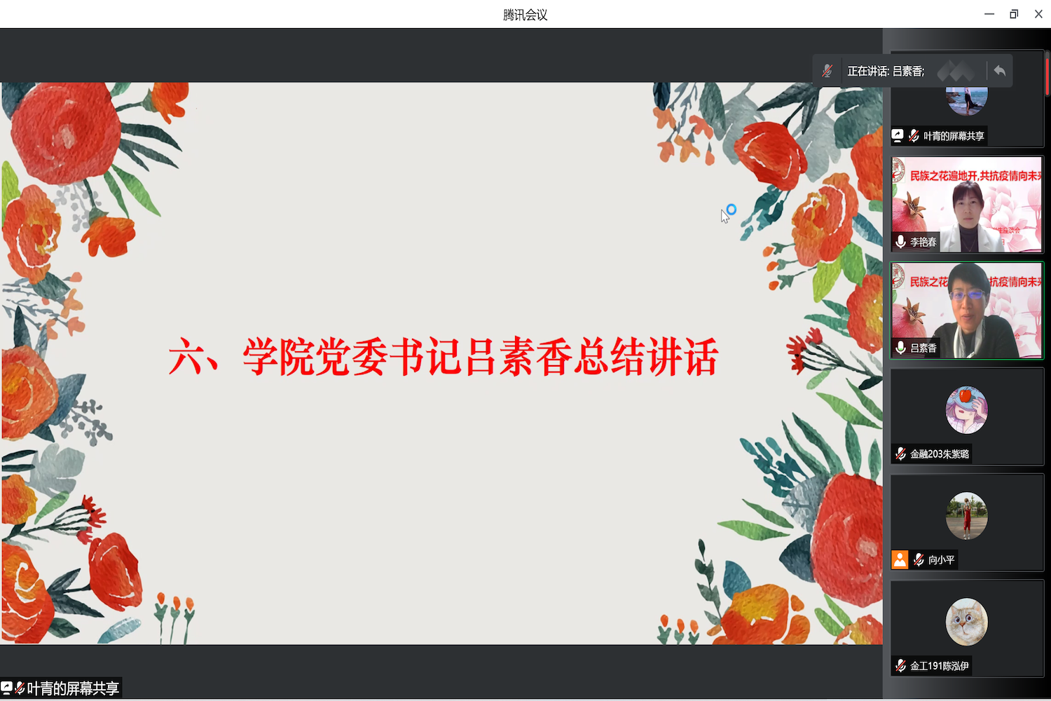 吕素香在总结讲话中对少数民族学生代表的精彩发言给予充分肯定,并感谢学生们对疫情期间居家学习的政策给予的理解和支持。她表示学院向来高度重视少数民族学生的培养、教育、管理和服务工作,并致力于把民族团结落实到指导学生日常的学习、就业、生活中,贯穿于培育人才的全过程,让少数民族学生生活好、学习好、发展好。隔空不隔爱,希望更多的学生可以向学院说出真心话、传递真感悟、表达真诉求,像“石榴籽一样团结在一起”,共同砥砺奋斗、凝心聚力,努力将小犇文化做成大牛精神。