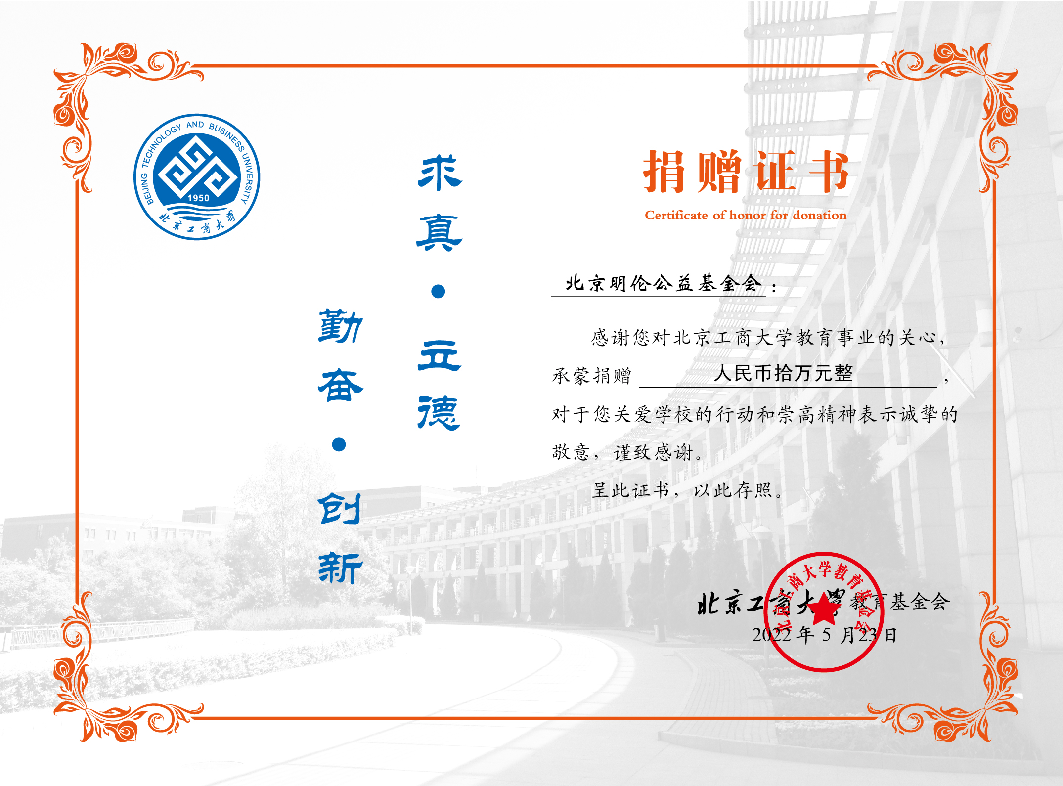 为支持学校疫情防控工作,经中共北京市扶贫济困领域基金会第一联合委员会书记易昌良联系,北京明伦公益基金会在获悉学校疫情防控封闭管理期间,后勤保障人员迎难而上、冲锋在前、坚持工作的消息后,深感一线抗“疫”工作者的艰辛和不易,经创始人秦东魁和理事长冯西见提议,理事会一致通过“支援北京市疫情防控捐赠项目”,向我校慷慨捐赠10万元,对工作在校园抗“疫”一线的食堂、物业、保洁、维修、保卫等后勤保障人员予以补贴。
