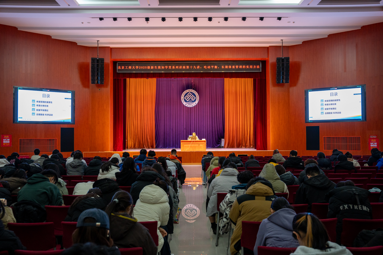 12月23日,北京工商大学在阜成路校区举行2025级新生“致知学堂”系列讲座第十九讲:吃动平衡,长期体重管理的实用方法。北京市体育科学研究所副研究员孙金秋围绕体重管理的科学标准、能量平衡原理、合理膳食与科学运动等内容展开分享,帮助学子树立科学的体重管理理念,掌握健康生活的实用方法。