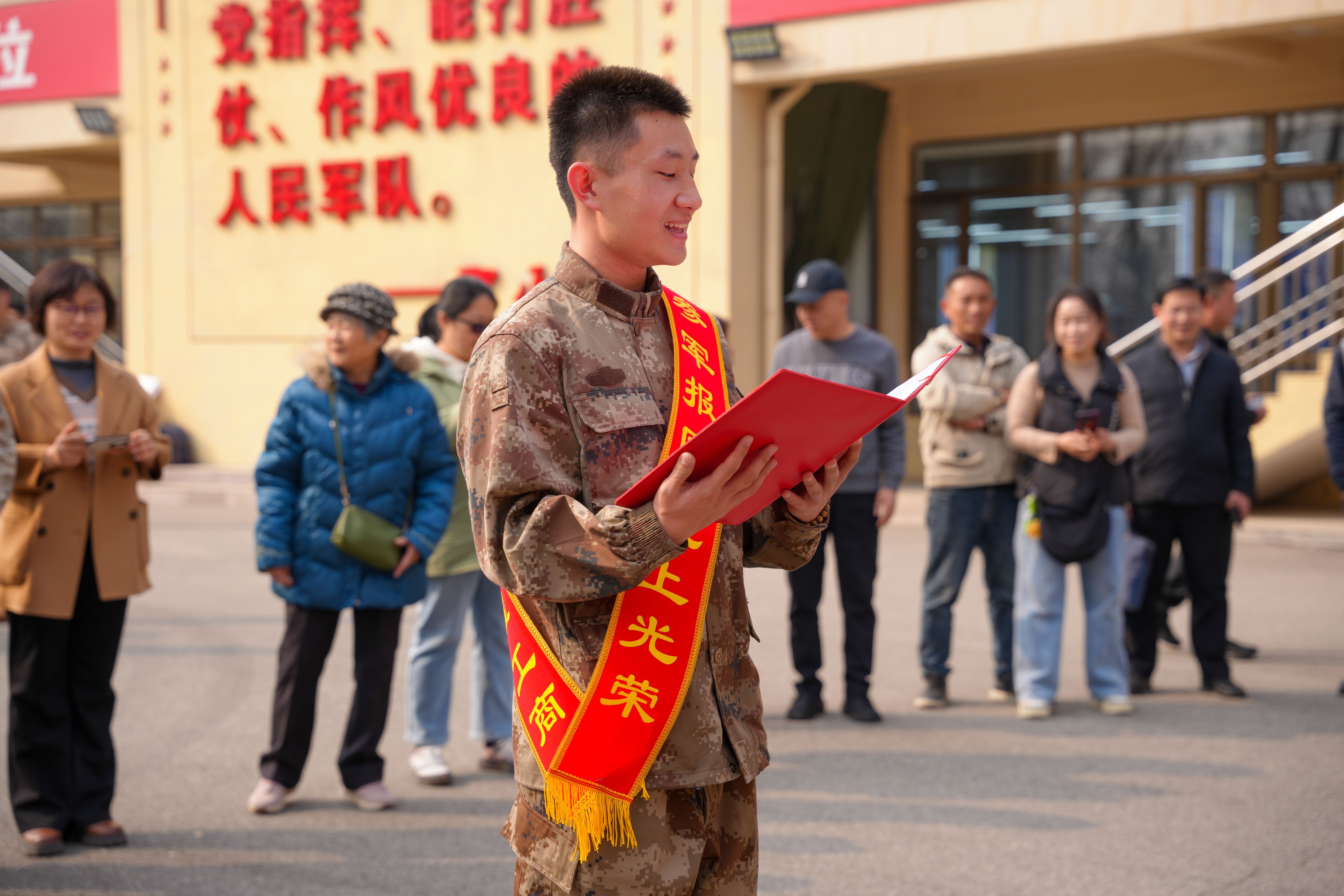退伍大学生代表史梦琪宣读2026年春季入伍学生名单。新兵们依次应答,声音铿锵有力,眼神坚定果敢。