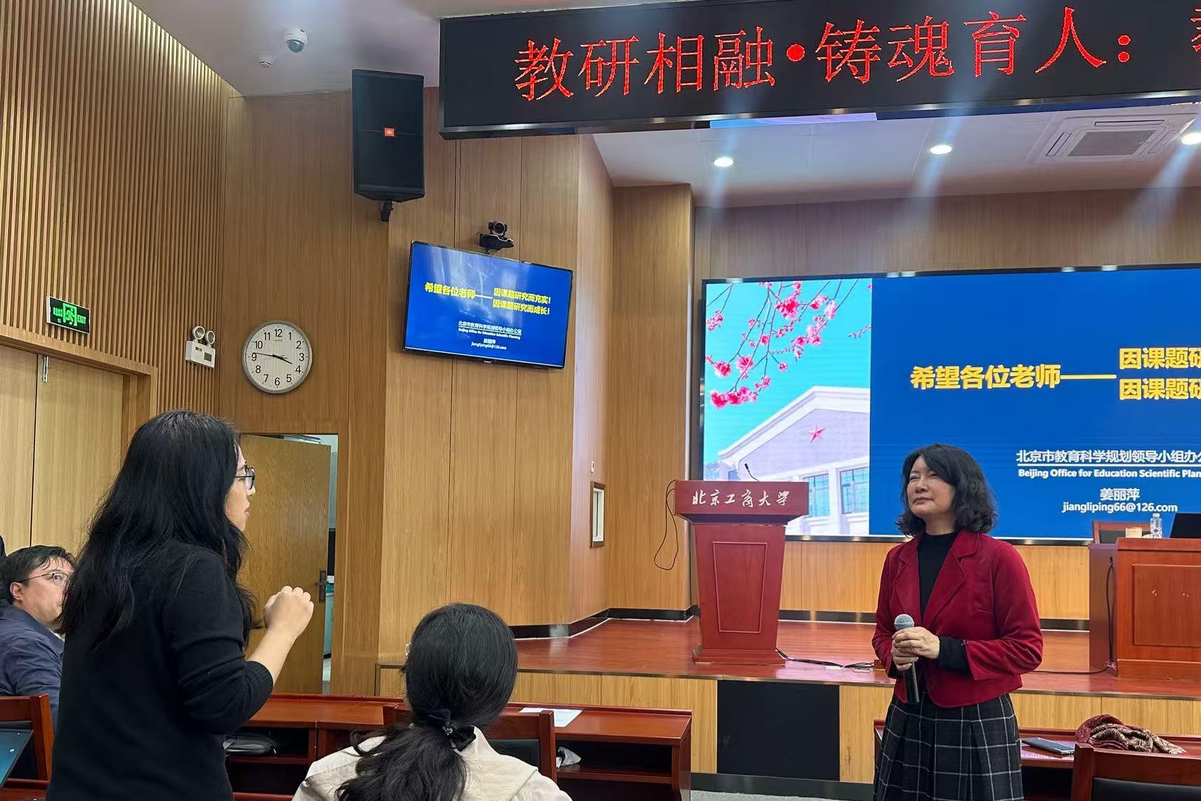 随后,姜丽萍主任以“培育科研意识 厚植科研素养”为题,紧扣《北京市教育科学“十五五”规划2026年度课题指南》核心精神,从评审专家的视角,为参训教师开展了系统、专业的课题申报指导。讲座围绕教育课题申报的选题方法、申报书撰写规范两大核心内容,系统梳理了选题中的常见误区、研究问题的来源与表述规则,结合大量典型案例,细致讲解了申报书各模块的写作要求、逻辑架构与填写技巧。同时,姜丽萍主任结合学校办学特色与学科优势,针对选题策略、研究内容凝练、研究方法设计等关键环节,精准解析了逻辑结构搭建、常见问题规避等实用方法,为教师们开展课题申报工作厘清了思路、提供了可操作的实践路径。