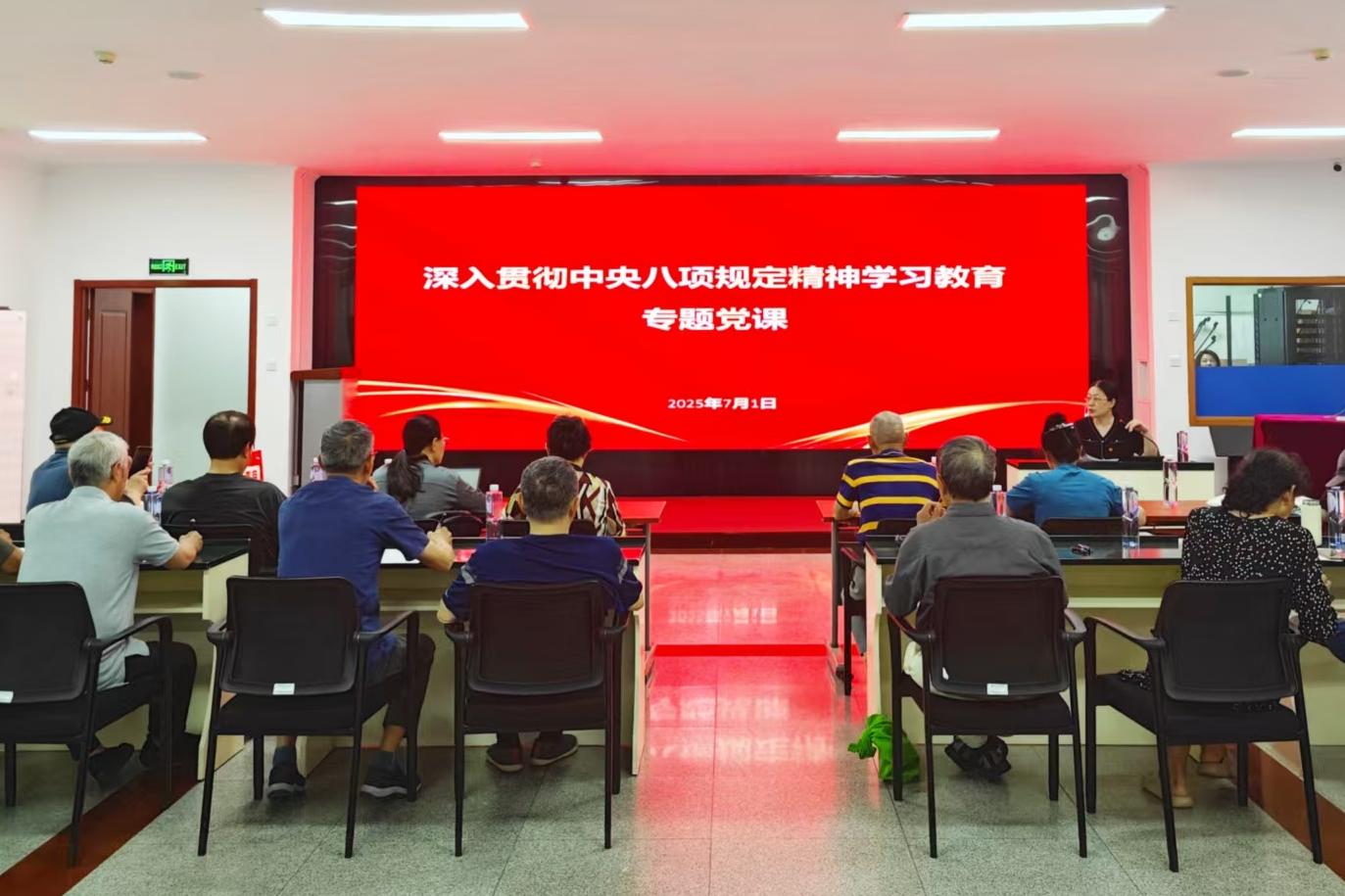 为推动中央八项规定精神在离退休党员干部中走深走实,强化纪律意识、永葆政治本色,以实际行动庆祝中国共产党成立104周年,7月1日,离退休党委书记王红英讲授深入贯彻中央八项规定精神学习教育专题党课。离退休党委理论学习中心组全体成员、各离退休党支部书记及党员代表参加学习。