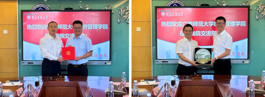 詹新宇热忱欢迎广西师范大学经管学院领导班子的莅临指导,介绍了北京工商大学经济学院发展历程、学科建设、师资队伍、人才培养等方面情况,并分享了“一个目标,三大重点,七项举措”学院学科建设整体思路。张海丰感谢经济学院的热情接待,主要介绍了广西师范大学经济管理学院历史沿革、学科建设、人才培养等基本情况,并分享了国际认证的相关经验。