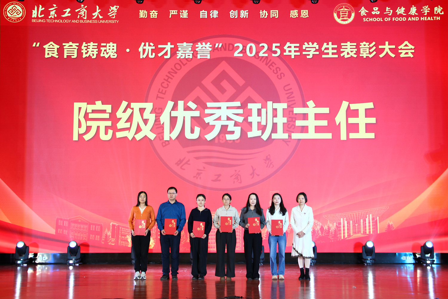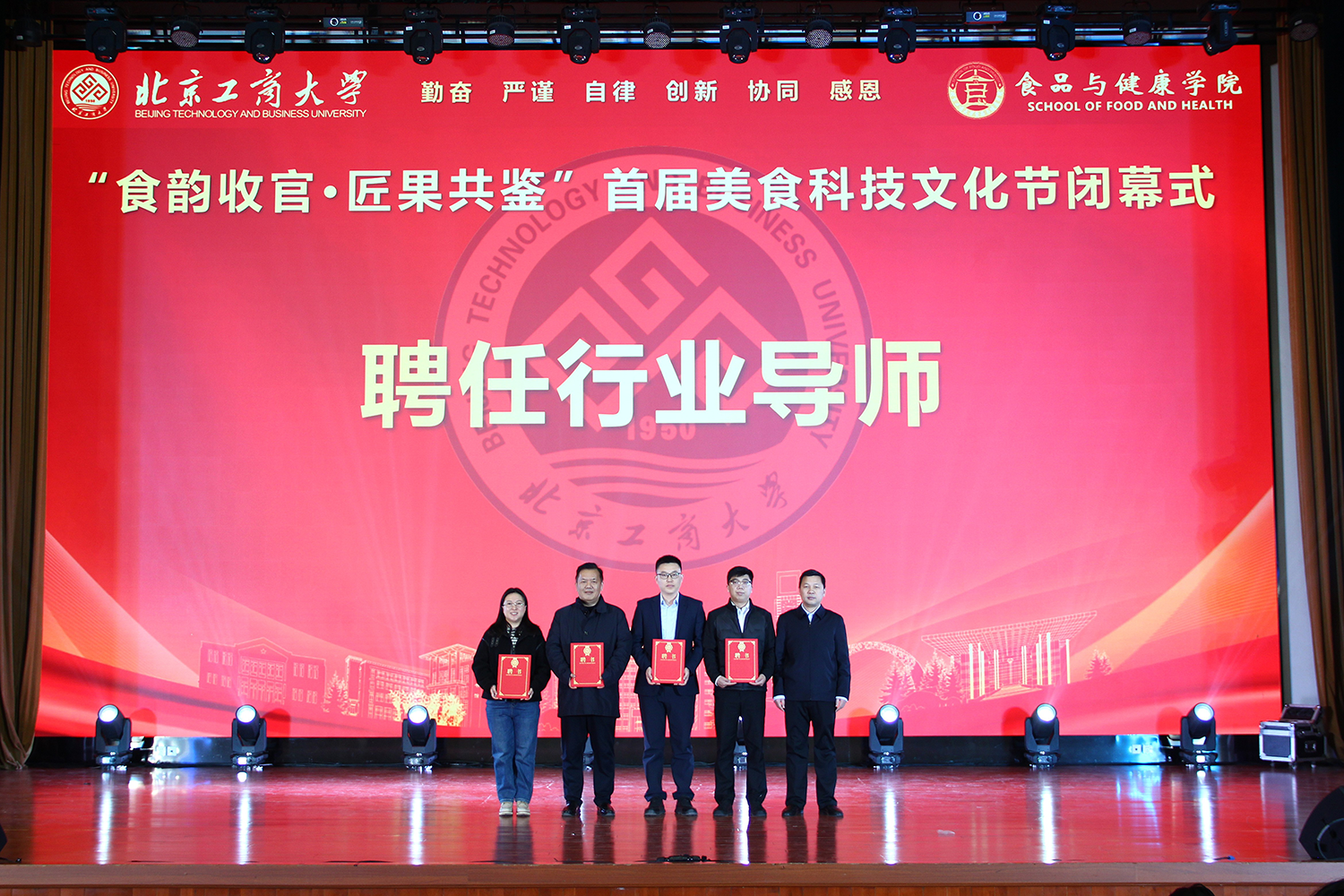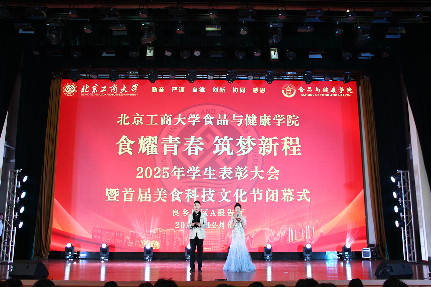 12月6日,食品与健康学院在良乡校区隆重举行“食耀青春 筑梦新程”2025年学生表彰大会暨首届美食科技文化节闭幕式。学校党委常委、副校长寇红江,学校团委书记单紫薇,学院特邀嘉宾味食源奖学金管理方代表、北京味食源食品科技有限公司董事长助理兼研发总监严江,钟香驹奖学基金管理人、钟香驹教授之女钟捷,中融百鸣投资管理集团有限公司董事长陶庆,北京康安利丰农业有限公司党支部书记、副总经理乔雪静,北京藻辰生物科技有限公司创始人杨阳,北京首朗生物科技有限公司常务副总经理李重阳,北京康比特体育科技股份有限公司产品开发中心总监王冬,食品与健康学院领导班子、各系主任以及教师代表、班主任代表、辅导员、学生代表齐聚一堂,共同见证学院人才培养成果,表彰先进典型。