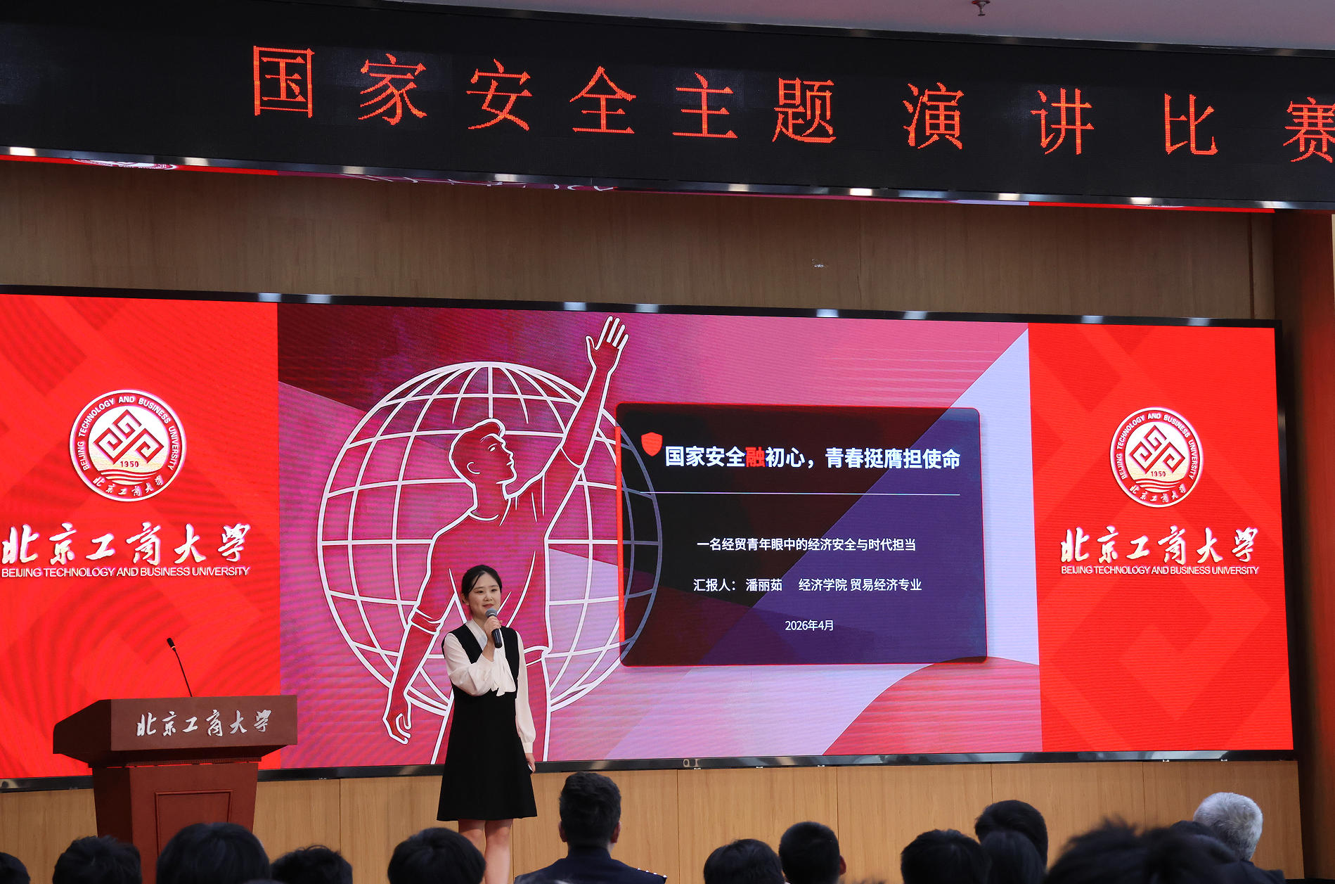 启动仪式后,国家安全主题演讲比赛总决赛正式上演。经过各学院选拔、校级初赛的激烈角逐,9名优秀学子脱颖而出晋级总决赛。比赛现场,9名选手按抽签顺序依次登台,紧扣“国家安全融初心,青春挺膺担使命”主题,结合自身专业学习与生活实践,围绕网络安全、科技安全、人工智能安全、信息安全、供应链安全等领域,用铿锵有力的语言、真挚饱满的情感,阐述对国家安全的深刻理解,讲述青年学子守护国家安全的责任与担当,展现了新时代北工商学子心系家国、奋发向上的青春风采。选手们的演讲立意深刻、情感真挚,或激昂慷慨、催人奋进,或娓娓道来、引人深思,一次次点燃现场气氛,赢得了评委和在场师生的阵阵掌声。