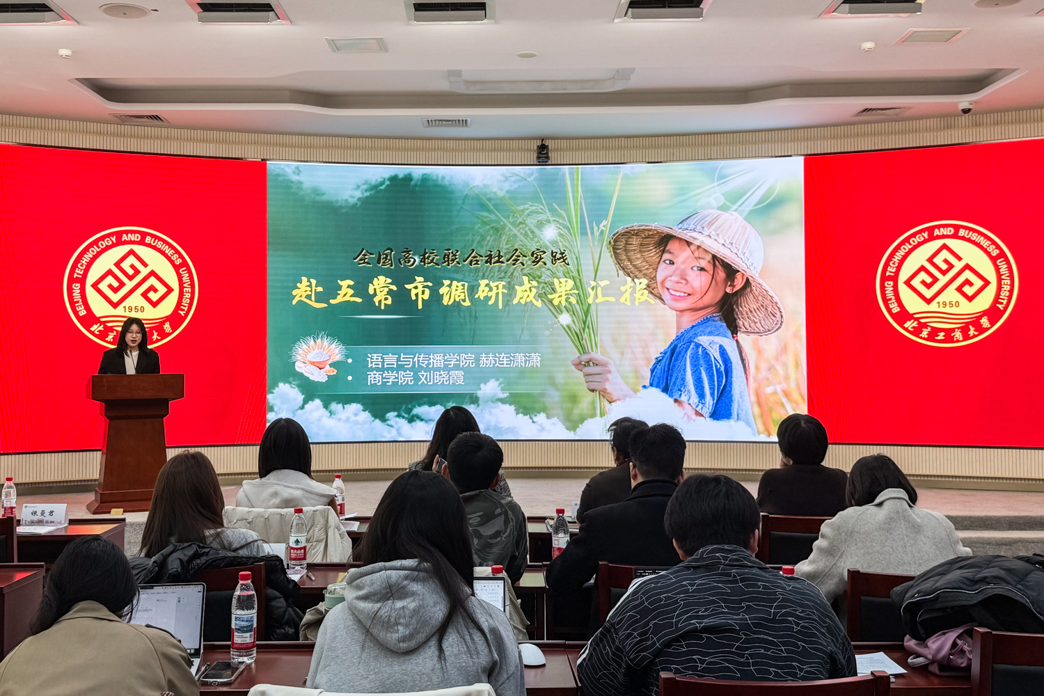 在成果汇报环节,各实践团代表依次分享实践收获。赴浙江工商大学实践团围绕数字经济、乡村振兴、红色根脉三大主题,古雪、刘真琦两位研究生分享了在杭州、衢州等地的调研见闻。从金砖合作中心的开放创新到腰塘边村的振兴路径,从婺剧文化的传承活化到衙前农民运动的红色初心,团队将专业所学与社会实际相结合,为乡村发展积极建言献策。赴南昌大学实践团代表匡维祎回顾了团队沿着习近平总书记视察足迹,走访江中药谷、光明社区、南昌八一起义纪念馆等点位的历程,深刻体悟江西十年发展成就及科技创新、社会治理、文化传承的时代内涵。赴哈尔滨工程大学实践团代表赫连潇潇分享了团队在五常市的乡村振兴调研成果。实践团以跨学科视角,走访博物馆、电商运营中心、物联网中心等7个点位,深入探索五常大米产业的品牌建设与科技赋能,并以实践视频形式凝练成果,形式新颖、内容扎实。