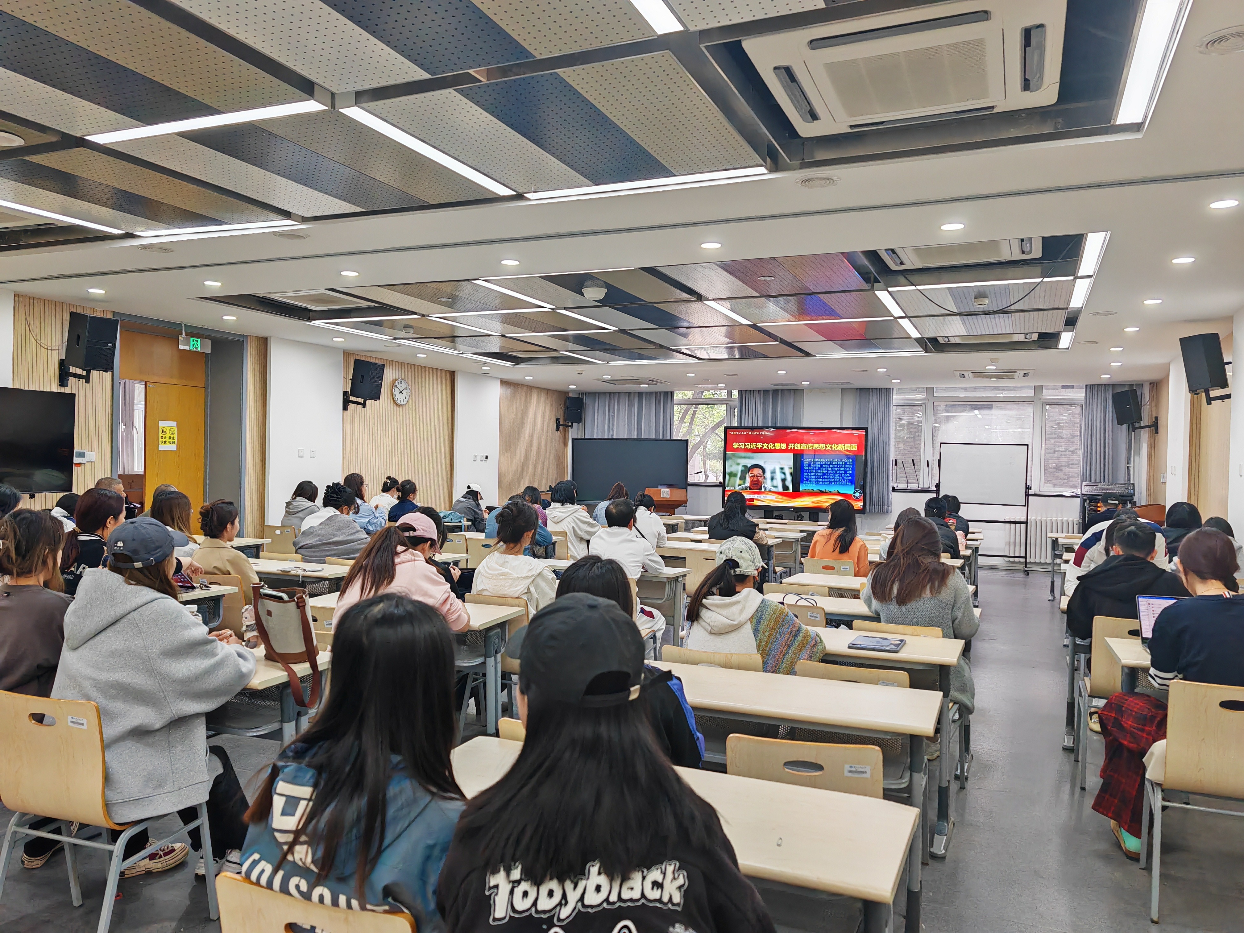 为深入学习贯彻习近平文化思想,切实增强做好新时代新征程宣传思想文化工作的责任感和使命感,落实党员基本培训要求。4月28日下午,北京市社会科学院(中共北京市委讲师团)邀请中央党校科研部副主任洪向华教授开展“理论家走基层”线上理论专题宣讲会,设计与艺术学院积极响应,组织学院师生在良乡主校区艺术楼A座101会议室集中聆听,并围绕宣讲会内容展开热烈讨论。