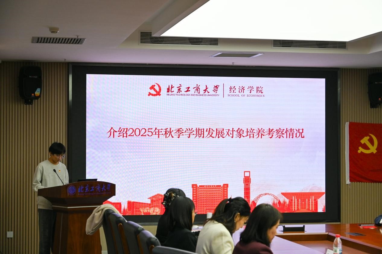 本科生党建工作室组织部负责人杨泽凯介绍学院2025年秋季学期发展对象培养考察情况。在学校党委和学院党委的坚强领导下,我院严格遵循党员发展工作的总体要求,持续优化积极分子培养考察机制,深化《北京工商大学经济学院积极分子“发展积分”制度》的实践运用,构建起多维立体、全程贯通的培养考察体系。秋季学期,经个人申请、组织谈话、积分评定、民主推荐、政治审查及集中培训等严格程序,39 名优秀发展对象在政治素养、作用发挥等方面表现突出,符合党员发展条件,经组织审批发展入党。这批新成员的加入,为党组织注入新的生机与活力。