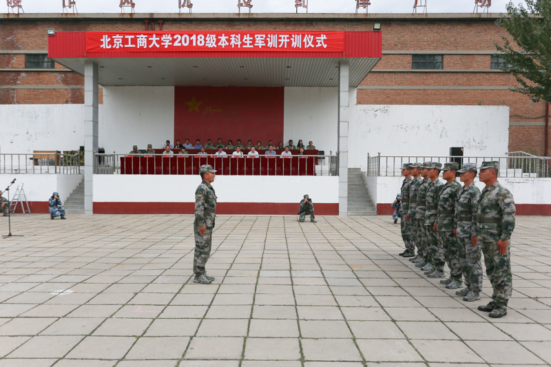 在庄严嘹亮的军歌声中,军训开训仪式正式开始。学校党委副书记、军训团总指挥张德玉宣读《北京工商大学关于开展2018级本科生军训并成立军训团的决定》。2018级学生军训时间为9月17日到29日,本次军训团划分为6个营、14个连,其中一营为商学院,二营为经济学院,三营为计信学院,四营为理学院和食品学院,五营为材机学院和法学院,六营为艺传学院和外国语学院。学校还选拔16名退伍大学生分散到各连担任副指导员。