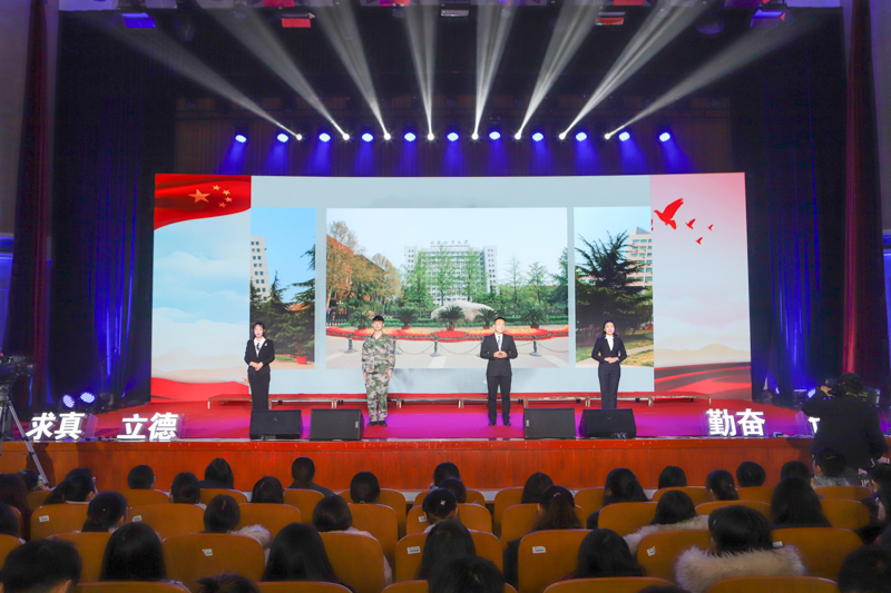 开场视频再现了83年前那段难忘的历史,回顾了过去一年学校坚持以学生为中心,坚持三全育人理念,在学生思想政治工作中取得的丰硕成绩。退伍老兵、学生党员、资助宣传大使代表在现场生动讲述了过去一年中,同学们不忘初心、艰苦奋斗、追逐梦想的精彩故事。