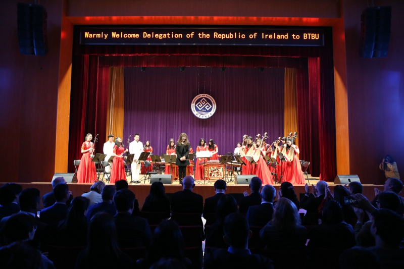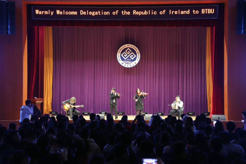 317日正值爱尔兰国庆日,来自我校的学生艺术团和来自爱尔兰的乐团在阜成路校区东区礼堂共同进行了“北工商爱尔兰日”交流演出。来自北工商的500多名学生代表和80多名留学生代表一同观看了演出。会谈结束后,在孙宝国校长和贾英民副校长的陪同下,部长代表团一行前往礼堂参加了此次活动。孙宝国校长、麦克休部长和谢百成校长分别在活动上致辞。