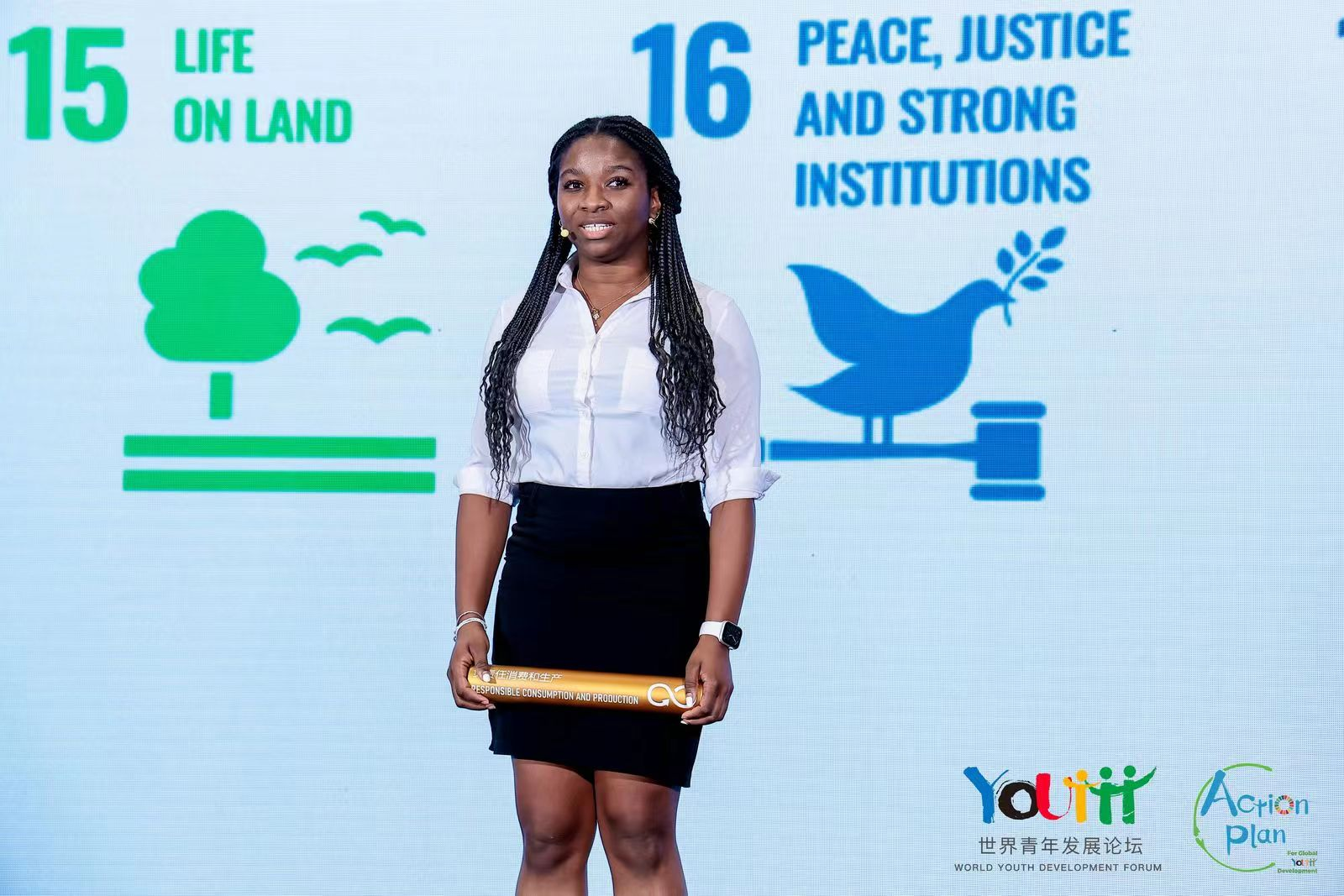 我校语言与传播学院广告系黄桂丽和莎娜分别点亮了第9项和第12项目标。黄桂丽谈到:“我来自柬埔寨,来到中国两个月后,我发现强大的基础设施是中国工业发展和创新的必要基础。2030年,我主张支持发展中国家的本土技术开发、研究和创新。”莎娜倡议:“我来自来自安提瓜和巴布达,已经来到中国4年了。在2030年,我建议通过预防、减排、回收和再利用来大幅减少废物的产生。”论坛最后,共青团中央书记处书记、全国青联负责人胡盛与17名中外青年共同点亮象征着联合国可持续发展目标的SDGs彩灯。