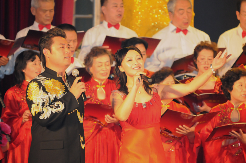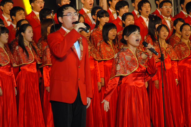 此次演出在我校学生合唱团的一曲《红旗颂》中拉开了帷幕。同学们身着华丽的红色晚礼服,个个神采奕奕,伴随着激昂的歌声,一张张笑脸绽放在绚丽的灯光下,同学饱含深情地诵出了对祖国母亲的一片赤子之心,感人至深。作为领唱的韩添和张一帆同学则带领大家用美妙的歌喉表达对祖国的祝福。场下观众跟随乐曲一齐挥动着手中的国旗,气氛热烈。张一帆在演出结束后告诉记者“正值祖国60年华诞之际,大家欢聚一堂,机会难得,我们与祖国共奋进,我们为祖国献歌喉!” 。