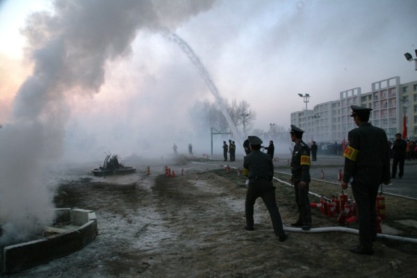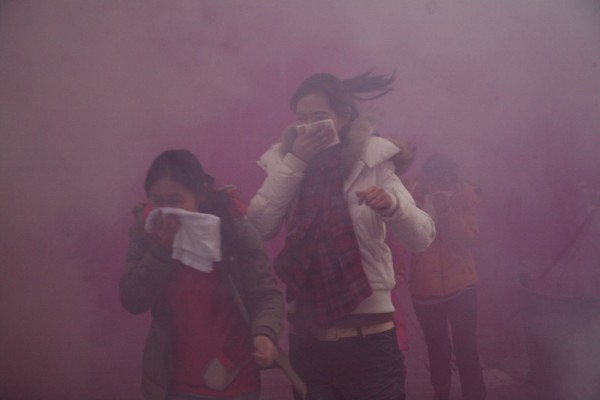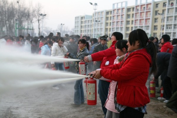 16:30警报长鸣,烟雾滚滚,消防演习正式开始。2000多名新生以毛巾掩面,有秩序地从烟雾中穿过。模拟现场非常逼真,给人以身临其境的感觉。四名保安人员还现场模拟了火场救护。之后,参演学生在生活区前操场集合,徐进团警官现场讲解了灭火器的使用方法后,部分学生和后勤人员饶有兴趣地在四个火堆前亲身体验了灭火器的使用。最后保安人员用消防水带将火堆扑灭。