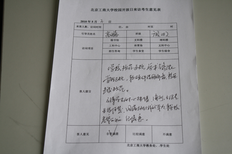 “付出是有回报的”,引导员赵豪杰笑容满面地翻开一沓沓的《北京工商大学校园开放日来访考生意见表》对记者说道,“你看,随便一翻都是‘非常满意’‘环境优美’‘引导员服务很热情’,所以,我们做起来是很有激情的,即便是累一点也是很值得的”。