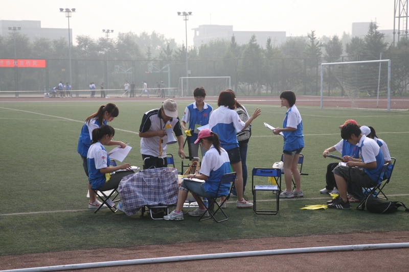 承担裁判员任务的志愿者们分散在各个比赛项目的场地。他们不畏惧烈日炎炎,尽管大汗淋漓也从不懈怠。赛道内侧的裁判员志愿者负责查看运动员有无犯规情况,他们的目光追随着赛道上的运动员们,为了做到公正他们不敢有半点松懈,随时用手中的笔记录每位运动员的情况;跳绳裁判员组织运动员集合签到后就要开始计时并目不转睛地盯着他们的脚下,尽量做到没有漏数或多数的现象;跳高裁判员要及时调整高度记录运动员成绩;跳远裁判员要仔细观察运动员是否踩线、并保证跳的距离记录没有误差。运动会对裁判员志愿者的要求很高,既要保持比赛的公平公正又要保证比赛的质量。任务虽然艰巨,但他们依然细致耐心地工作在各自的场地,工作之余他们也为运动员们加油打气。负责检录的志愿者们要提前组织运动员集合,并把他们带到各自的比赛场地,保证运动员按时参赛。