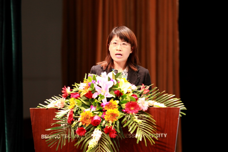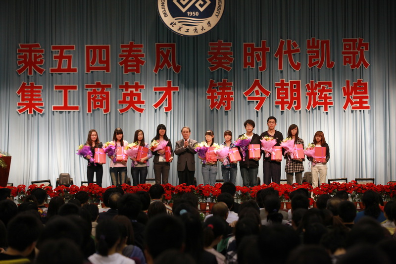 艺术与传媒学院学生王飞代表获奖学生发言,他表示,在纪念五四运动的同时,青年学生要发扬艰苦奋斗、勇于创新的精神,他还代表北京工商大学学生会向我校所有同学发出弘扬五四精神,认真贯彻胡锦涛书记提出的“三点希望”的倡议。