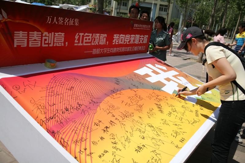 活动现场还举行了首都大学生向建党90周年献礼万人签名巨幅征集活动。来往的同学纷纷在征集板上签名,以表达对党、对祖国的祝福和感恩之情。