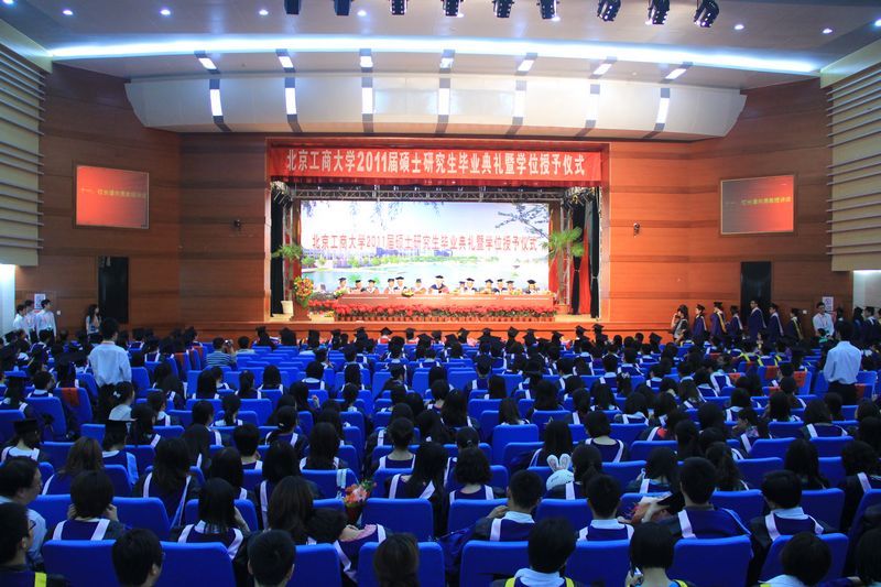 5月27日,北京工商大学2011届研究生毕业典礼暨学位授予仪式在阜成路东区礼堂隆重举行。校长谭向勇、校党委副书记卢思锋、校党委副书记、纪委书记张德玉、副校长谢志华、副校长李朝鲜、副校长张耘出席典礼大会。参加大会的还有理学院、食品学院、材料与机械工程学院、计算机与信息工程学院、经济学院、商学院、法学院、艺术与传媒学院、研究生部的领导以及研究生导师代表、全体2011届研究生和部分毕业生亲友。毕业典礼由副校长谢志华主持。