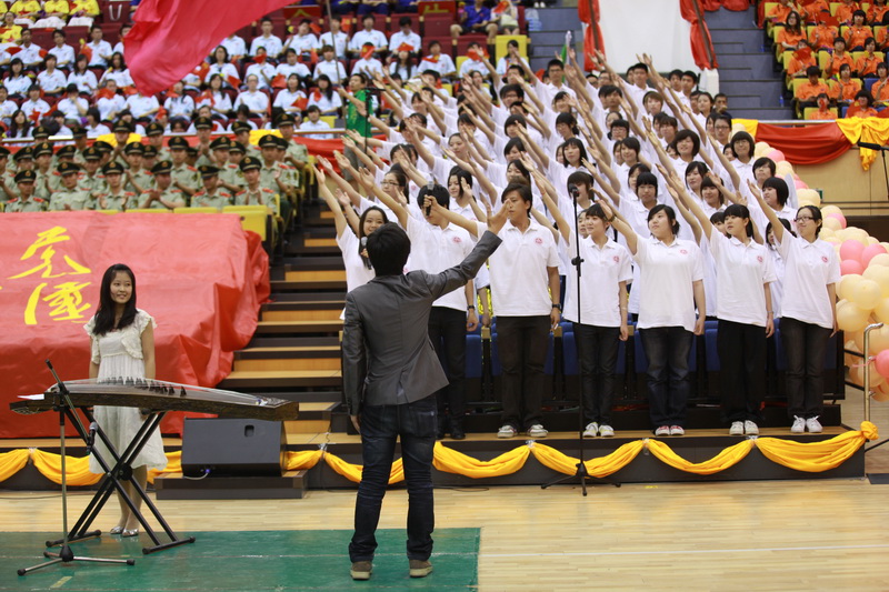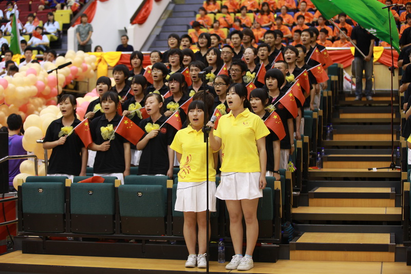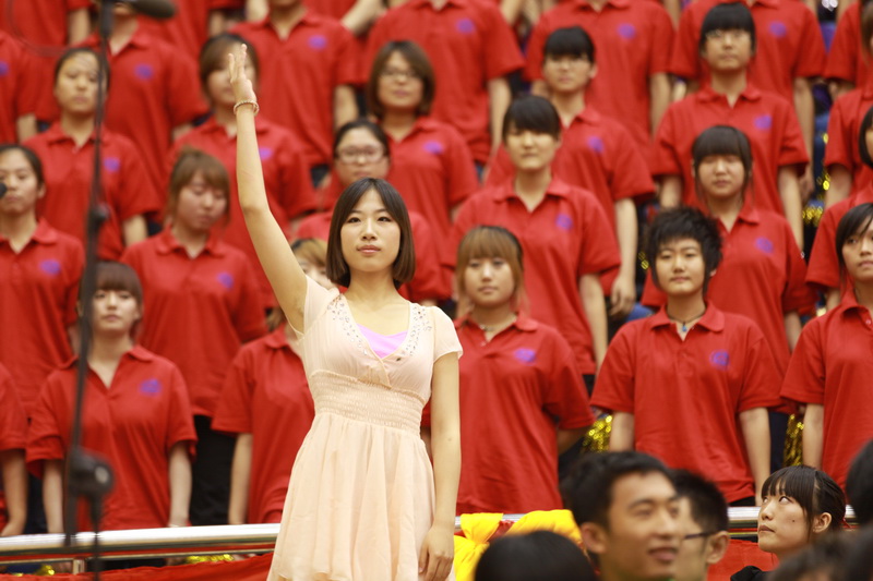 第一个演唱的外国语学院以《年轻的朋友来相会》开唱,展现了当代大学生的青春活力。应着全场观众的掌声,《红旗飘飘》的歌声飘荡全场,诠释了当代大学生对祖国的无限热爱。