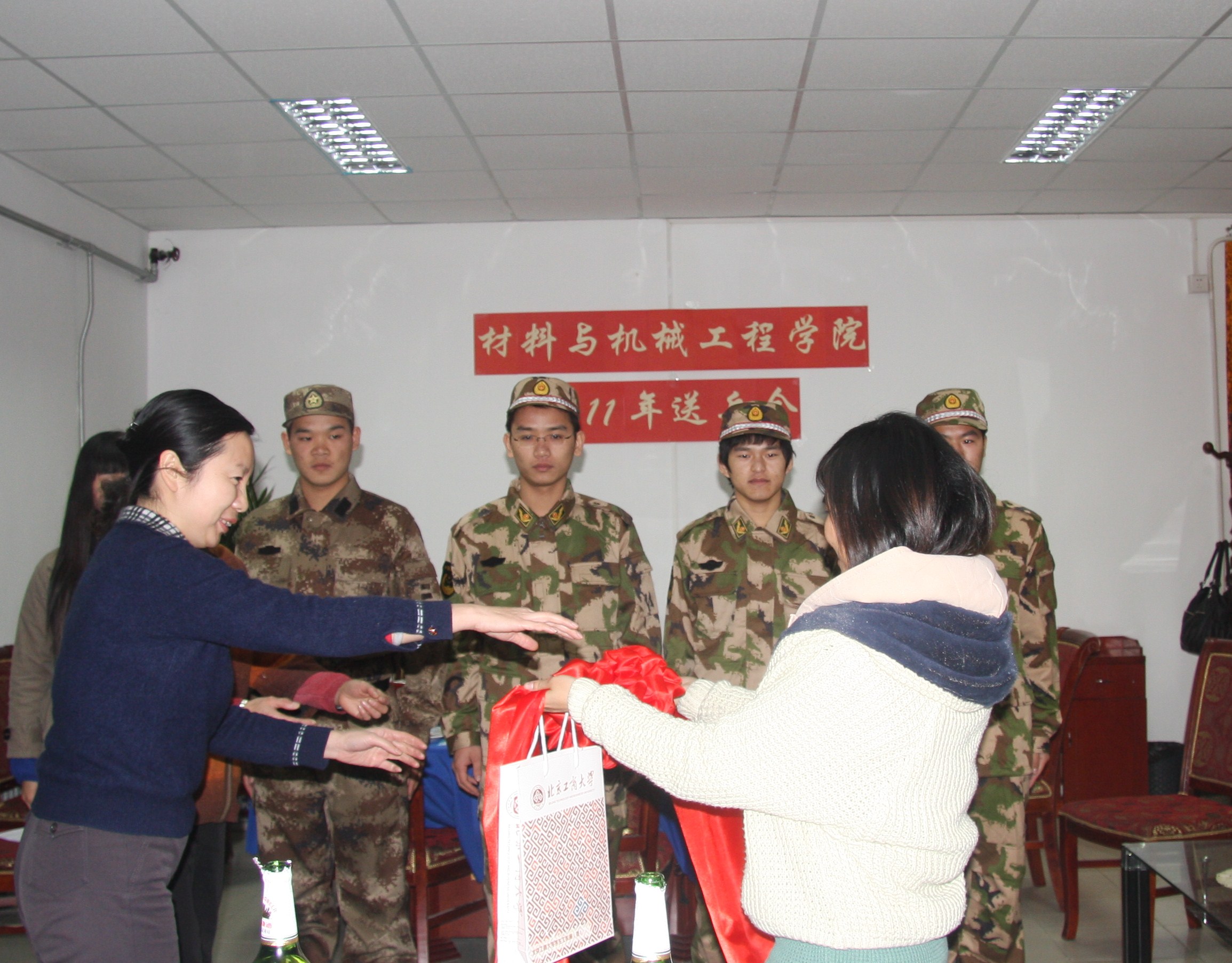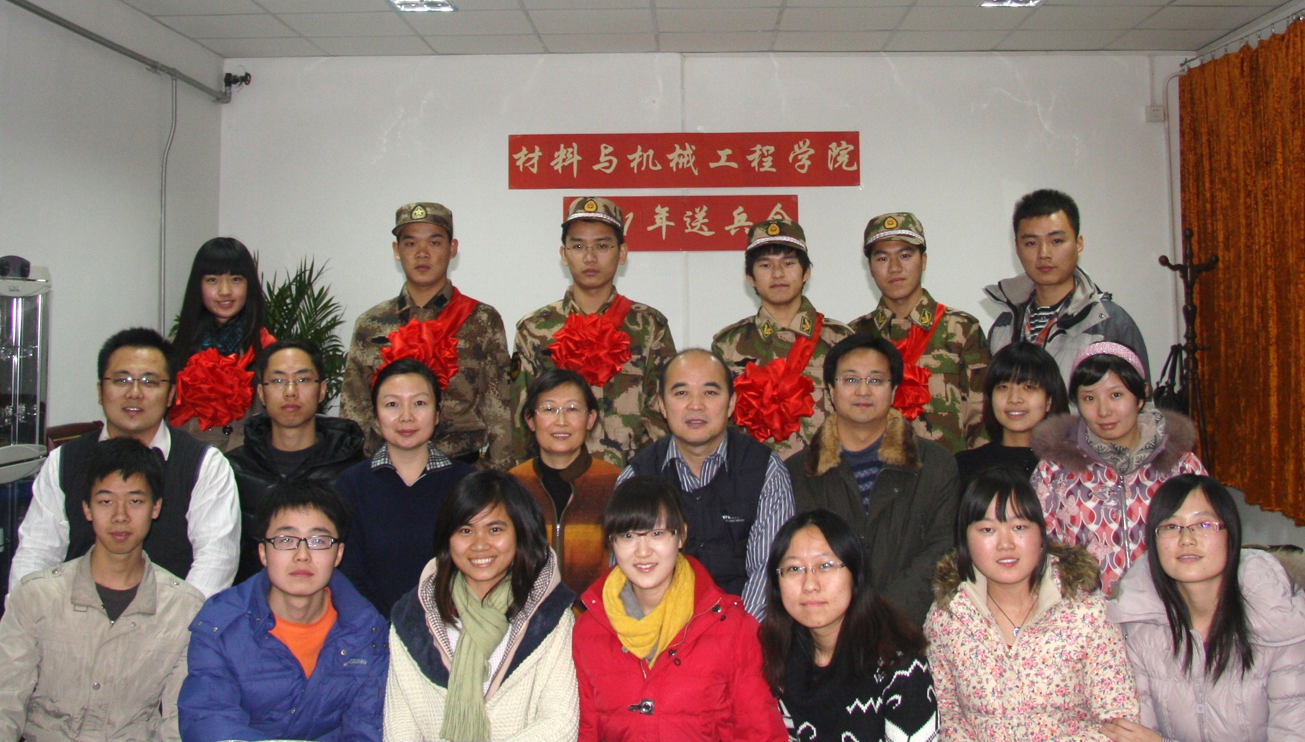 为了迎接老兵,欢送新兵入伍,材机学院于12月8日下午举行了2011年材料与机械工程学院老兵复员、新兵入伍欢迎欢送会。学院党总支书记吕东燕、党总支副书记马春晖,辅导员、入伍新兵及其班主任、退伍老兵、学生代表参加。