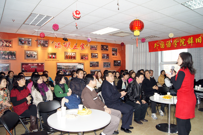 12月23日下午,圣诞前夕,外国语学院分工会在良乡校区装饰一新的工会之家举办了一场生动活泼、热闹非凡的辞旧迎新联欢会。参加晚会的教职工达60余人,是外国语学院有史以来人数最多的一次。联欢会由刘明宇、郑昊霞两位老师主持,学校党委副书记兼工会主席张德玉、副校长李朝鲜也应邀参加了联欢会。