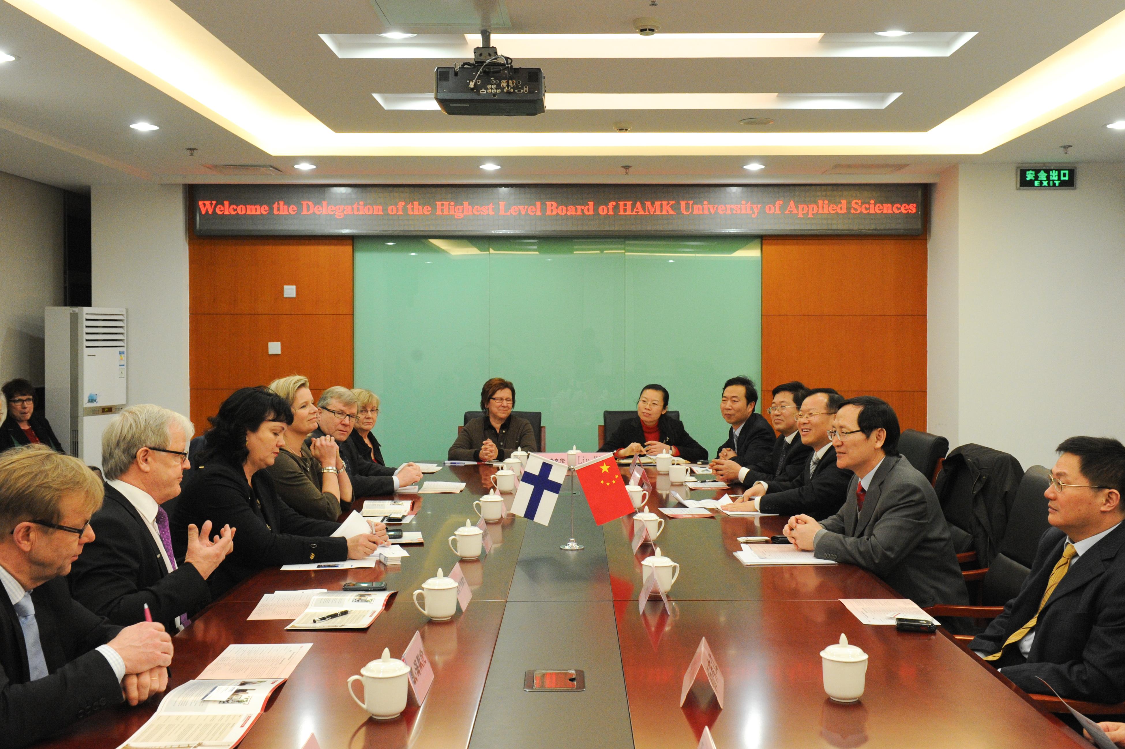芬兰海门市教育代表团团长、芬兰海门市高等职业教育委员会主席明娜•琳特伦(Minna Lintonen)对谭校长和李副校长的热情接待表示感谢,对北京工商大学发展所取得的成绩表示钦佩。她介绍了芬兰海门市高等教育的基本情况,并希望能和我校积极拓展全方位的合作关系。芬兰海门市联合会理事会主席莎莉•罗迪奥(Sari Rautio)介绍了理事会的基本情况,并希望此行能开拓与我校的合作和交流。芬兰海门理工大学校长维尤•亨特塞伦(Veijo Hintsanen)说,中国经济取得了令世人羡慕的成绩,高等教育发展迅速,有力地促进了中国经济社会的发展。访问团此行目的是来中国学习。他同时回顾了两校合作所取得的成绩,希望两校合作关系能得到进一步地开拓和加深。