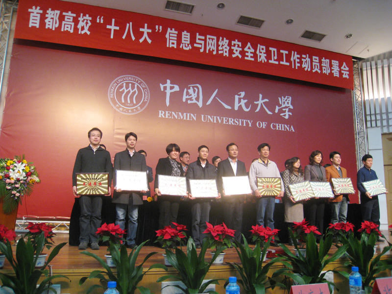 3月22日,首都高校“十八大”信息与网络安全保卫工作动员部署会在人民大学召开。大会对首都高校信息与网络安全保卫工作先进单位进行了表彰,我校及中国人民大学、北京科技大学等十所学校被授予“信息与网络安全保卫工作先进单位”的荣誉称号。
