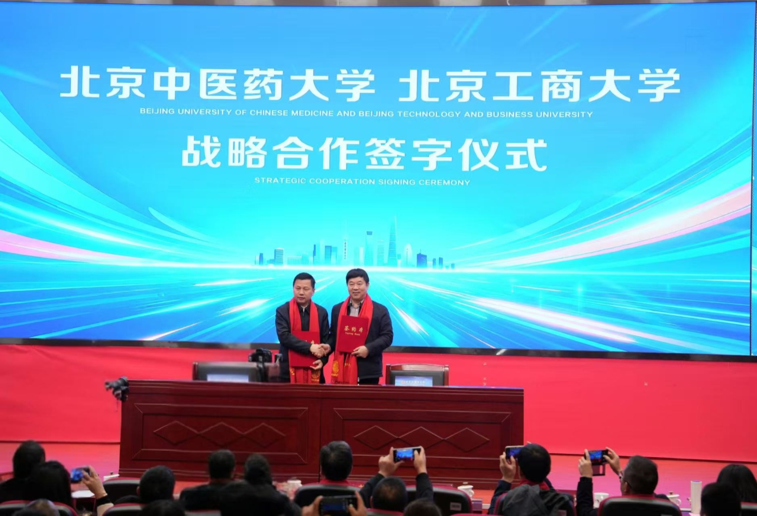 我校党委常委、副校长寇红江在致辞中对各位专家学者的参会表示诚挚欢迎,指出“药食同源”已上升为国家战略性新兴产业,本次大会既是响应中央号召、传承岐黄薪火的具体行动,更是推动中医药在新时代主动融入、积极服务健康中国战略的生动实践,希望学校与北京中医药大学强强合作,发挥中药/食品等龙头学科作用,交叉创新,助力药食同源产业更好更快发展。会上我校与北京中医药大学签署战略合作协议,双方将在联合科研攻关、人才培养、平台共建等方面开展深入合作,不断为服务北京及国家战略需求贡献智慧与力量。