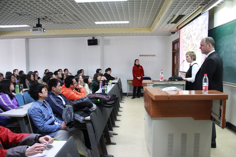 会见之前,代表团到我校良乡校区为我校学生进行了合作项目的介绍。会场座无虚席,同学们认真听取项目介绍并踊跃提问。现场的热烈气氛显示出我校学生对出国留学的极大热情以及学生们对我校与牛津大学赫特福德学院合作项目的高度关注。