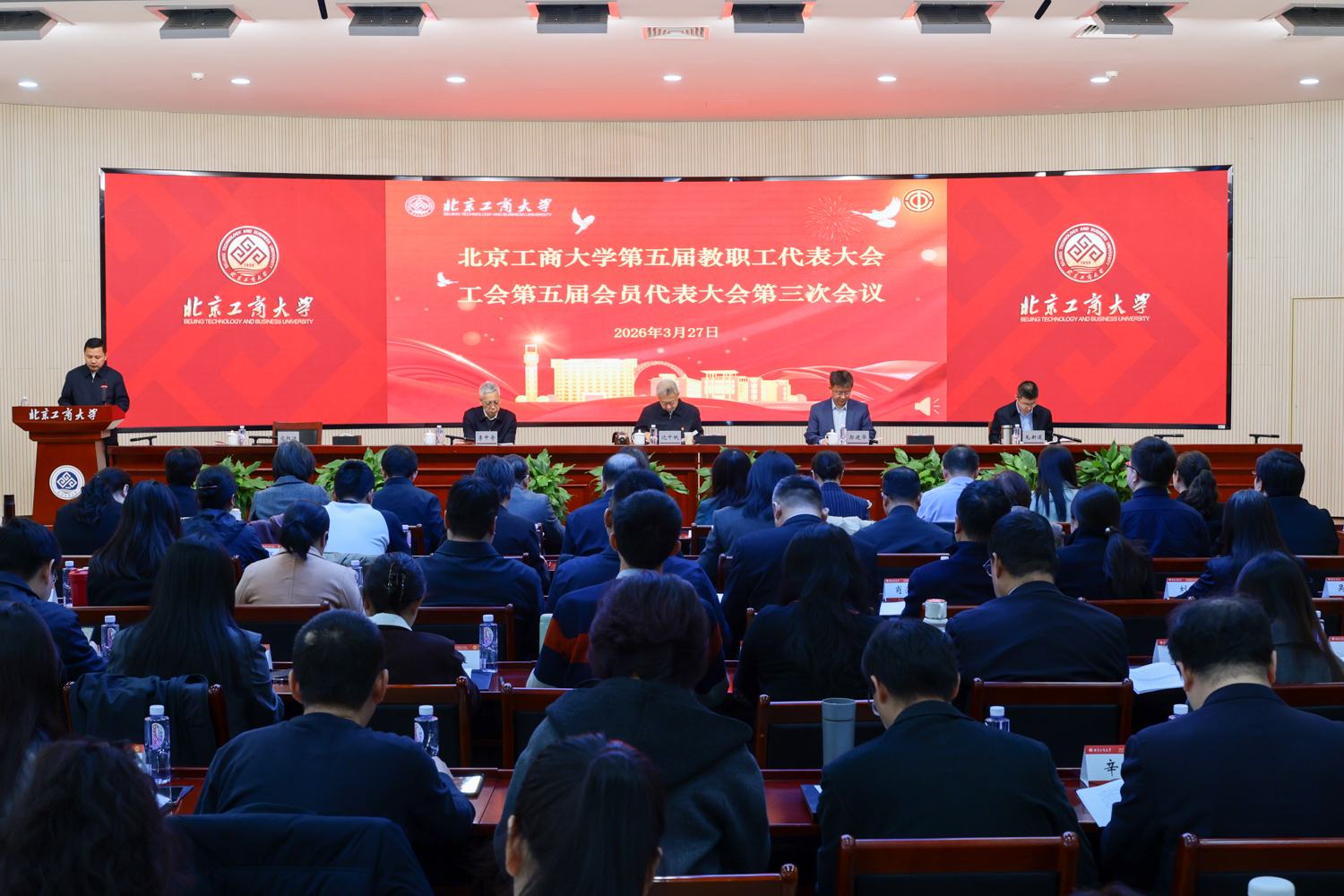3月27日,北京工商大学第五届教职工代表大会、工会第五届会员代表大会第三次会议在良乡主校区召开。校领导沈千帆、郭建华、李中奇、毛新述出席大会,教代会代表、工代会代表、列席代表参加会议。会议由党委常委、副校长寇红江主持。