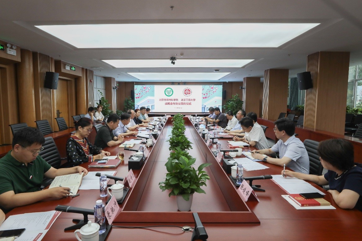 北京市农林科学院党组成员、副院长张闯、杨国航、燕继晔,学校党委常委、副校长徐丹丹、左敏及相关部门负责人出席会议。