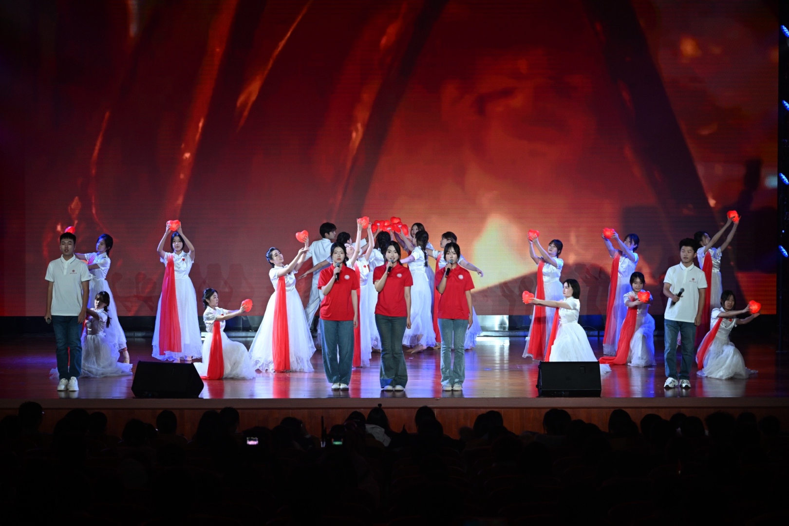 校合唱团登台领唱,台上台下所有同学心手相连,全场形成《歌唱祖国》大合唱,传承“一二·九”精神的磅礴力量,在实现民族复兴的赛道上奋勇争先,跑出属于北工商学子的最好成绩,共同唱响新时代北工商爱国主义最强音!