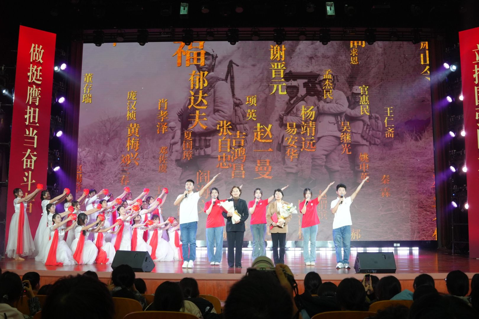 随着歌舞节目《铭记》激情上演,“青春力量篇”拉开帷幕,该节目以纪念抗战胜利80周年献礼歌曲《铭记》为核心,以歌舞为主要表现形式,“一二·九”运动参与者后代陆莹女士、黄玫女士为青年学子解读“一二·九”精神,激励青年学子勇担时代重任,接力走好“新长征”的奋进之路。
