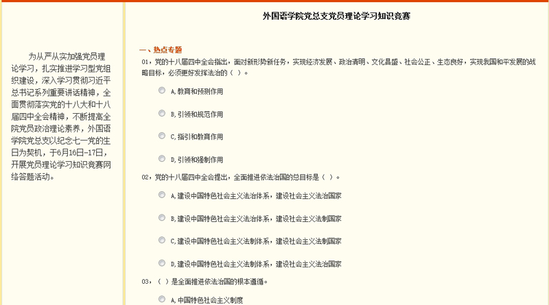 为从严从实加强党员理论学习,扎实推进“三严三实”专题教育,建设学习型党组织,外国语学院党总支实现“互联网+” 理论学习创新,近期开展党员理论学习网络知识竞赛活动,各个党支部广泛参与,“以赛促学”,开展理论学习及专题研讨,以实际行动纪念“七一”党的生日。