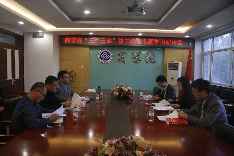 10月27日,商学院围绕 “严以用权,真抓实干,实实在在谋事创业做人,树立忠诚、干净、担当的新形象”主题在阜成路校区召开了“三严三实”专题教育第三阶段研讨会,并对第三阶段的学习进行了回顾和总结。商学院院领导班子成员王国顺、欧阳爱平、杨浩雄、毛新述、孙永波、樊江涛参加会议。 按照学校党委的统一部署,商学院党总支在 9—10月份开展了“三严三实”专题教育第三阶段学习研讨,坚持做到专题教育与日常工作有机融合、相互促进,合理组织、内容丰富、保障效果、重在落实。 第一,品读经典,提升修养。今年商学院党总支从党员活动经费中为全院76位教工党员购买了理论学习资料,有《习近平总书记系列重要讲话读本》、《习近平谈治国理政》和《道路自信:中国为什么能》。学院领导班子成员带头认真研读,认真做笔记,进一步加强了党员的党性修养。 第二,重温历史,不忘使命。8月学院党总支按组织部要求布置全体党员及干部观看《筑梦中华》、《红色家书》,9月中旬组织师生观看《百团大战》等纪录片,大家的心灵得到进一步洗礼。通过学习,大家深化了对于高等学校育人职能的认识,高校不仅是向学生传授知识的场所,也是对学生进行道德教育的一个重要阵地;具有培养人、教育人的特殊使命,在高校教学、管理、服务等岗位的共产党员必须具有高尚的思想道德,言传身教,为人师表。 第三,主题报告,指引方向。商学院在阜成路校区先后组织两场主题报告。9月18日,在综合楼三层报告厅举办“勿忘国耻,圆梦中华”——纪念抗战胜利70周年报告会,邀请中国人民抗日战争纪念馆副馆长罗存康为全校师生代表带来“伟大胜利 历史贡献——永远不能忘却的历史”主题讲座;10月27日,邀请首都师范大学历史学院教授、博士生导师迟云飞教授为大家带来关于中国近现代政治史的主题报告。学院领导干部全部参加上述主题报告。 第四,专题研讨,巩固成果。在专题教育研讨会上,学院领导班子成员就如何坚持用权为民,自觉遵守宪法法律和党的纪律,按规则、按制度、按法律行使权力,敬法为纪,为政清廉,任何时候都不搞特权、不以权谋私、不侵害师生利益和学校利益;如何坚持民主集中制,自觉接受监督,不搞大权独揽、独断专行;如何坚持从学校改革发展稳定的大局出发,谋划事业、推进工作,敢于担责、勇于创新,攻坚克难,努力创造一流工作业绩等,结合本职工作进行了发言。比如王国顺谈到“严以用权”首先应做到“自律”;欧阳爱平说“自律”的同时应加强制度建设和监督。 习近平总书记强调:“有权必有责。看一个领导干部,很重要的是看有没有责任感,有没有担当精神。”通过第三专题的研讨、学习,大家进一步提高了责任和担当意识。“三严三实”的专题教育虽针对党员领导干部,但作为修身做人律己的行为准则,应该说对每个人尤其是党员适用。在全院大会上,学院党总支向全体教师汇报了本学院“三严三实”专题教育活动的进展,自觉接受大家的监督;同时要求学院全体教工党员要深入学习“三严三实”,要把“严”的精神和“实”的品格在商学院所有党员教工身上扎根,在各自的岗位上,扎扎实实地把各项工作做好。