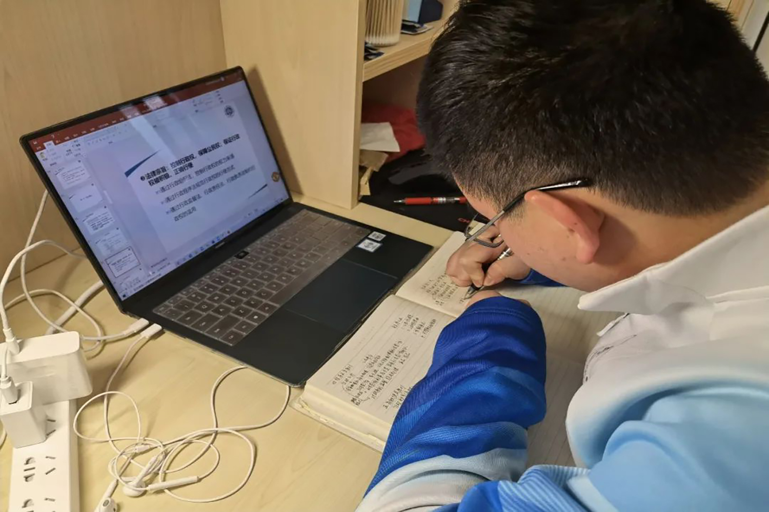 依据学校疫情防控及冬奥服务保障专班的要求,学校前期采取线上的方式进行教学。为此学校冬残奥会志愿者开启了“半工作、半学习”的状态,尽管志愿者要同时兼顾志愿服务与学业,但他们丝毫没有懈怠,课上认真听讲、积极回答问题,课后积极完成作业、整理学习笔记。