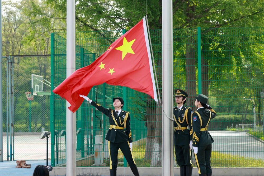五星红旗冉冉升起,全场师生共同唱响国歌。