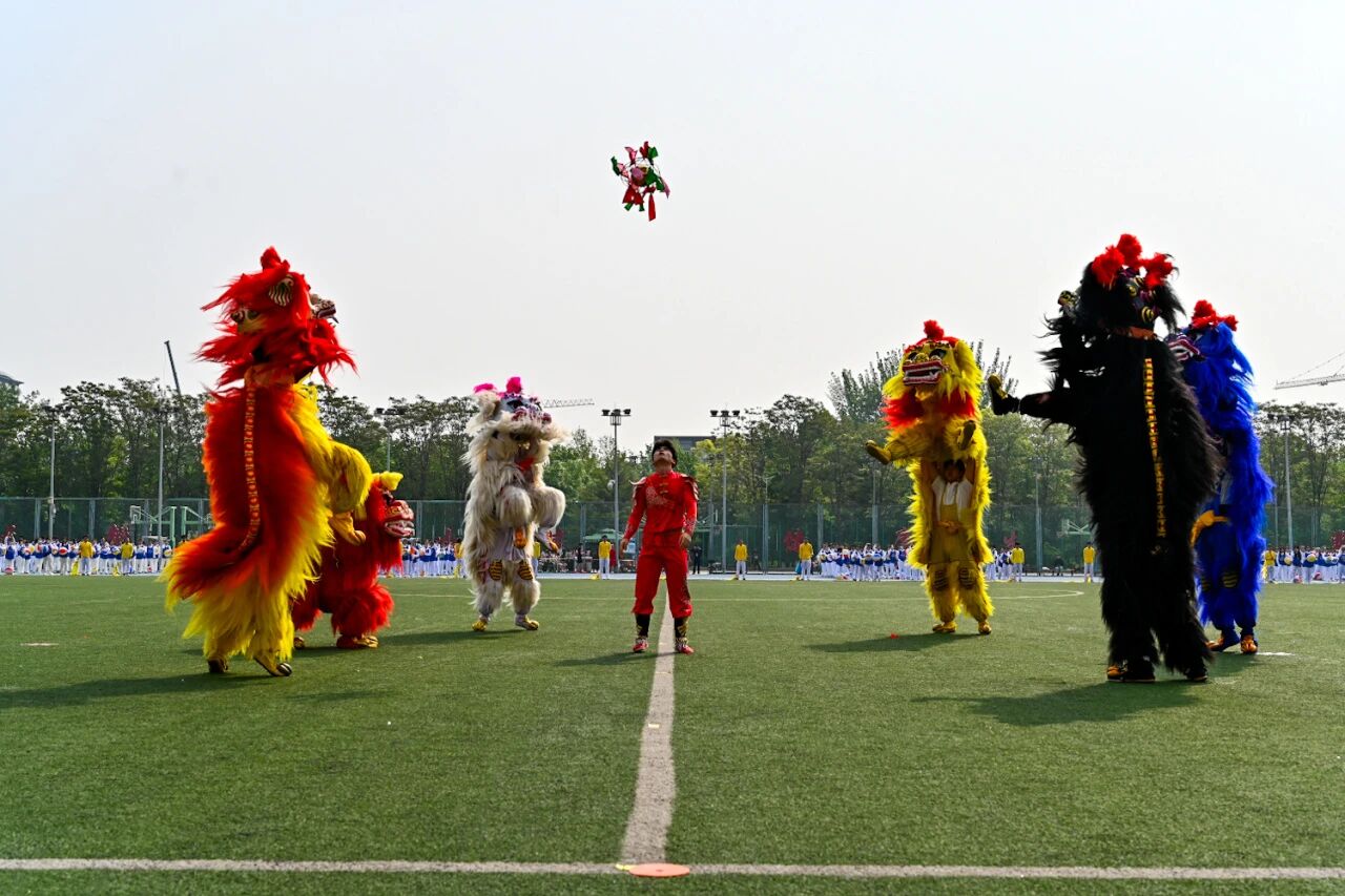 北京体育大学龙狮队员也为这片绿茵场带来了别样的风采,眨眼、扑跃、甩头,威风的瑞狮把全场的热情点燃。