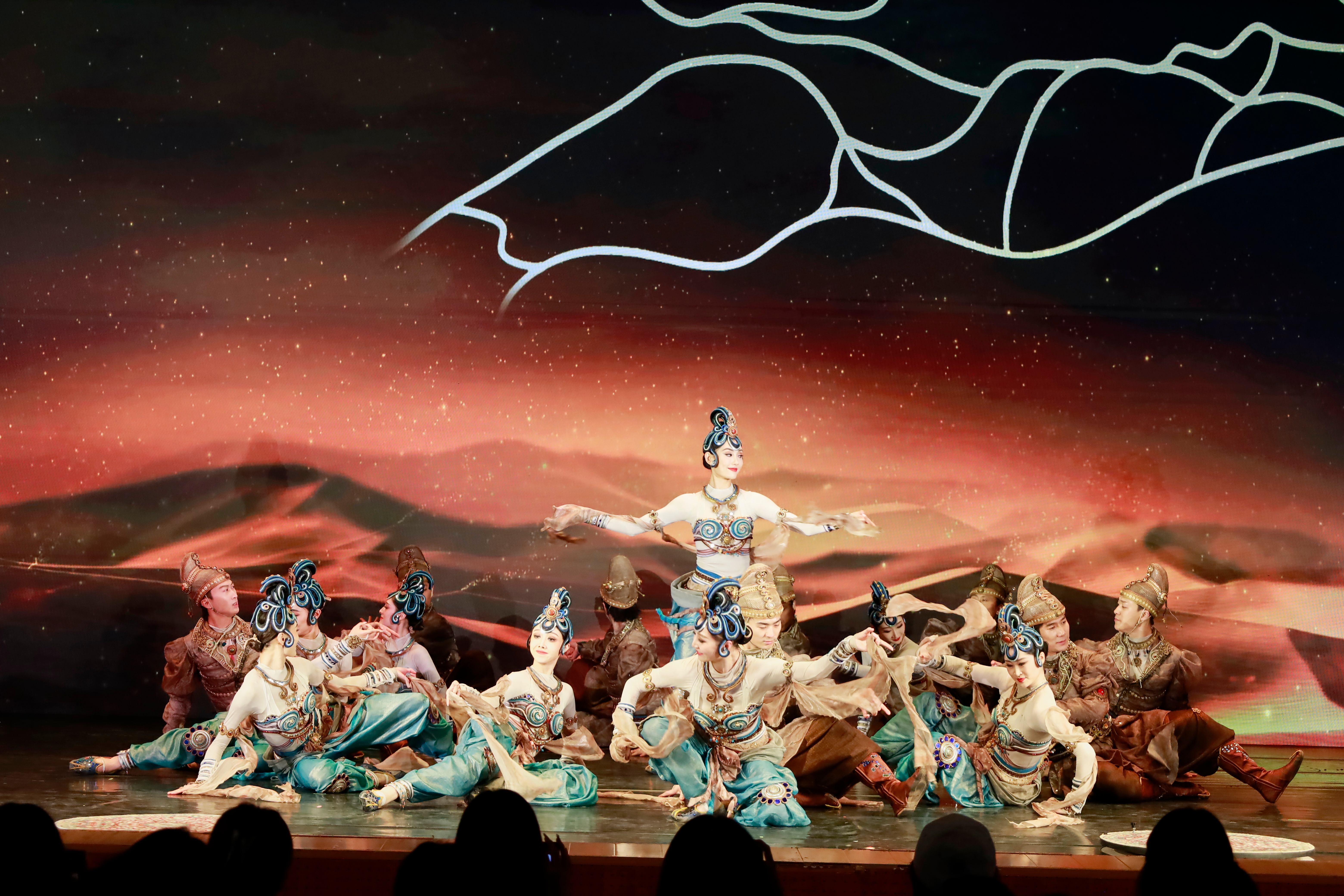 唤醒沉睡记忆,重现盛世乐舞。群舞《丝路·胡旋》美轮美奂,舞者们用曼妙热烈的旋转与精湛的舞姿,再现了古丝绸之路的繁华盛景,用艺术之美诠释了丝路精神与文化交融的独特魅力。